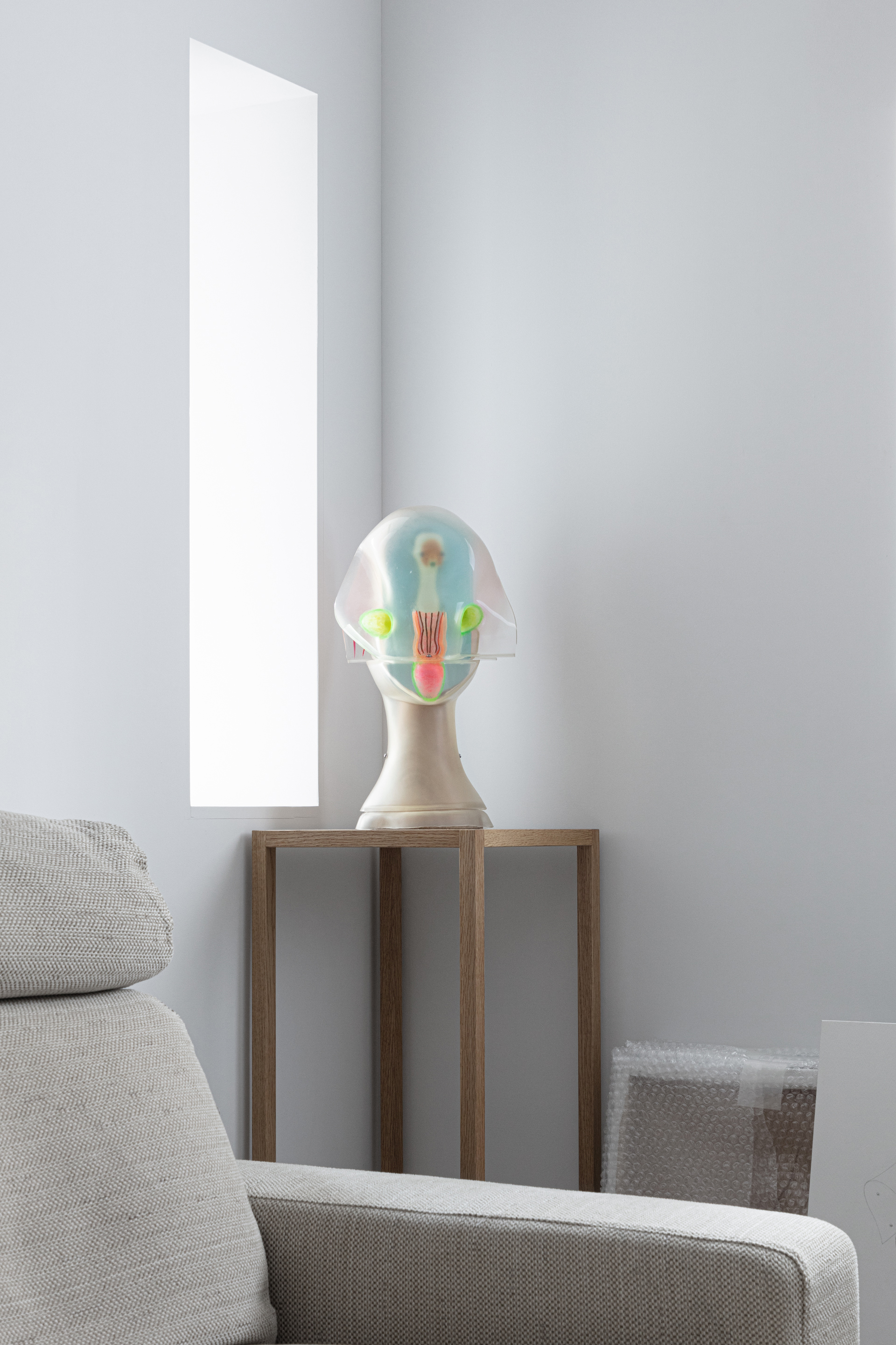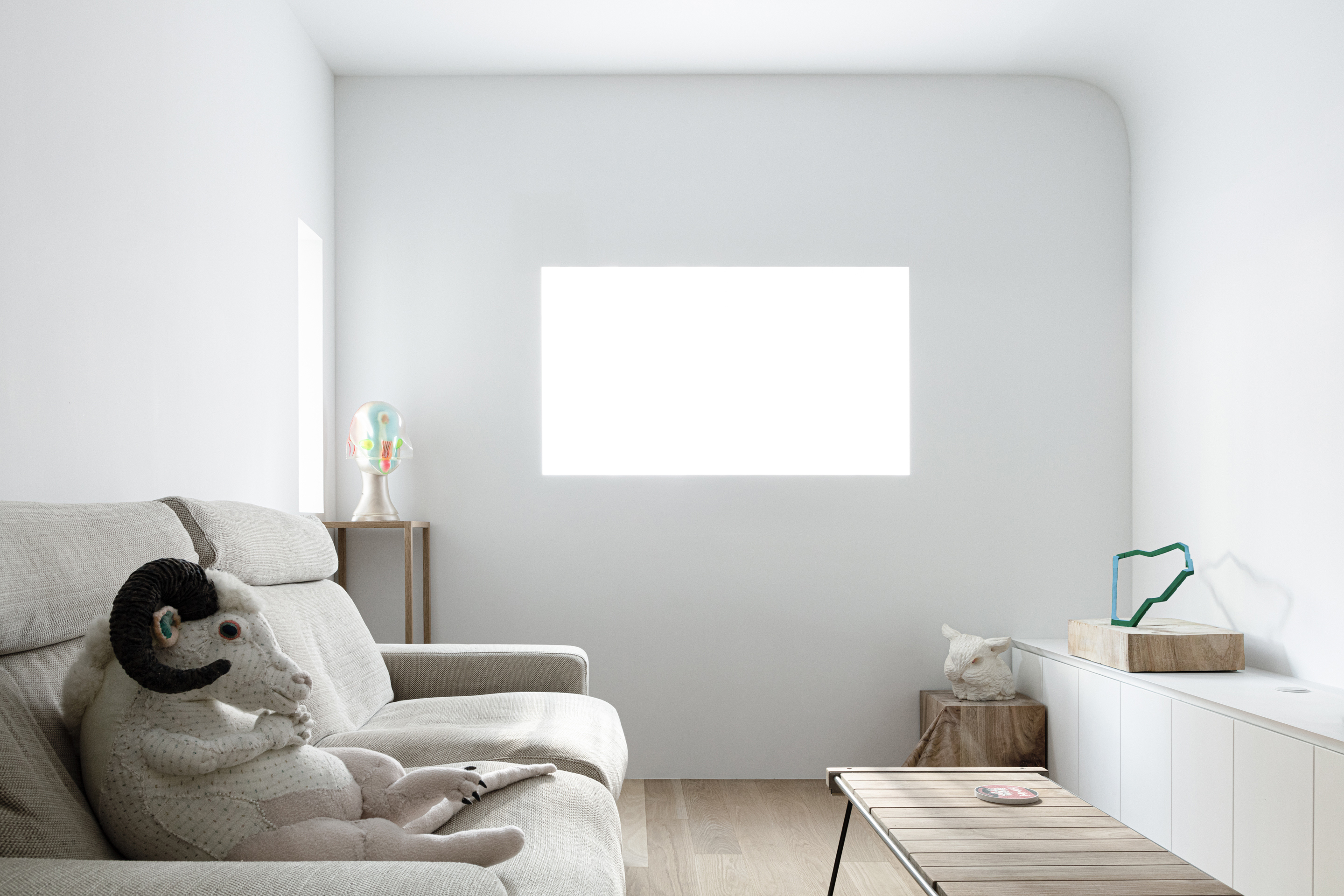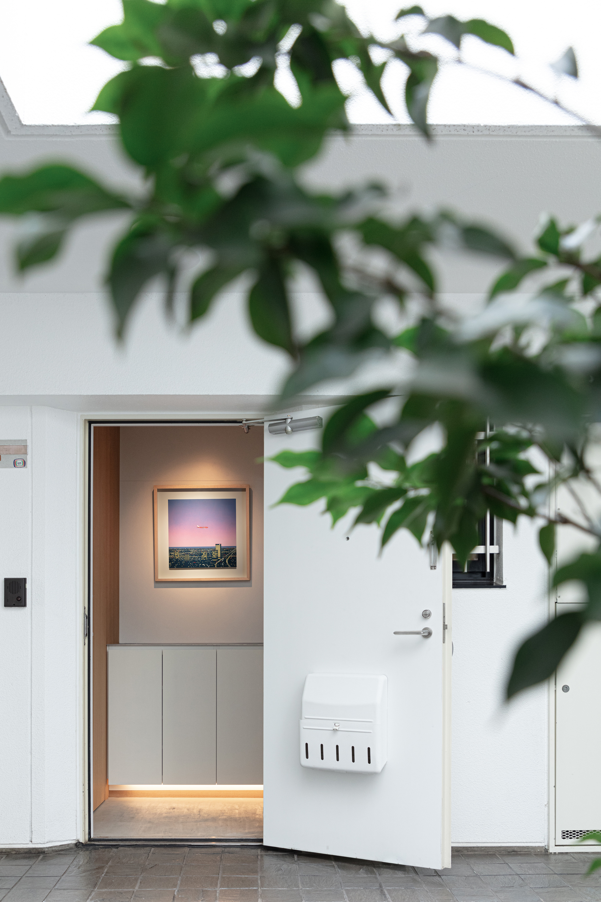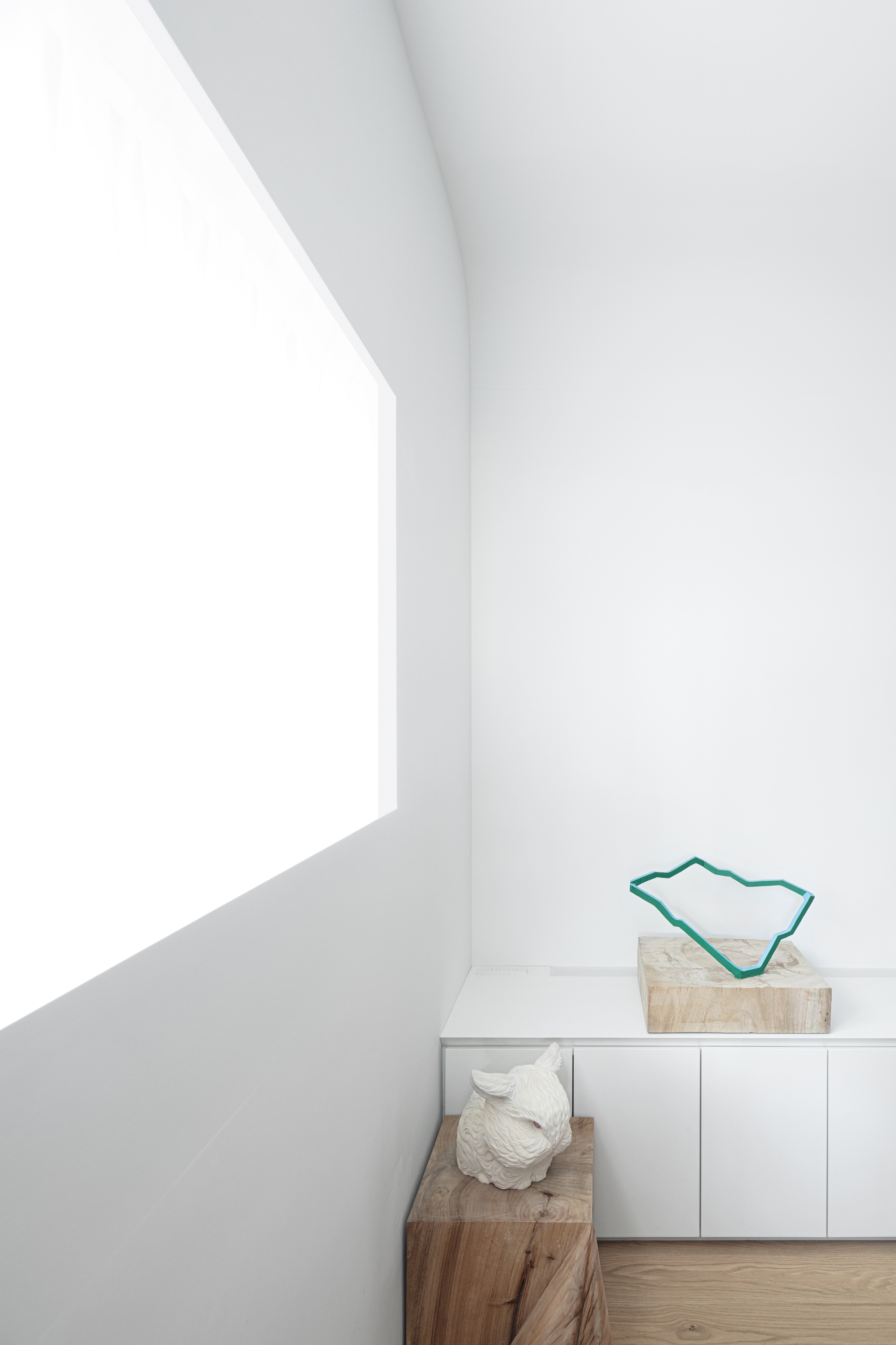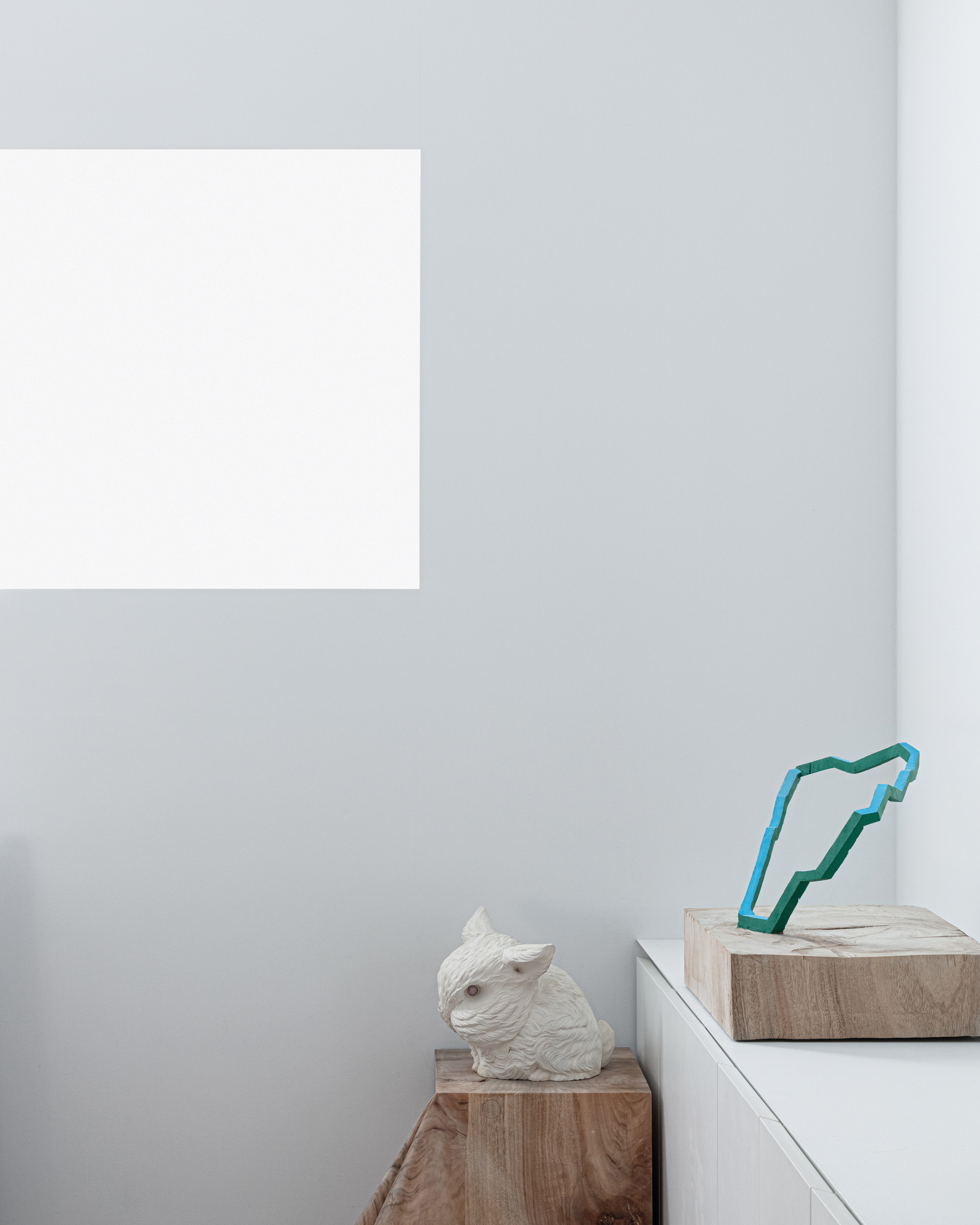 既存躯体の天井面、壁面から飛び出ている柱梁、マンション共用部分の黒い窓枠、露出しているカーテンレール、素材の切り替わりが目立つ巾木といった、‘家っぽさ’を印象付ける要素が表にでないように仕上げていくことで、アートが生活感に埋もれ過ぎてしまわないような空気感や、執筆活動の集中力を妨げない適度な緊張感を目指していった。