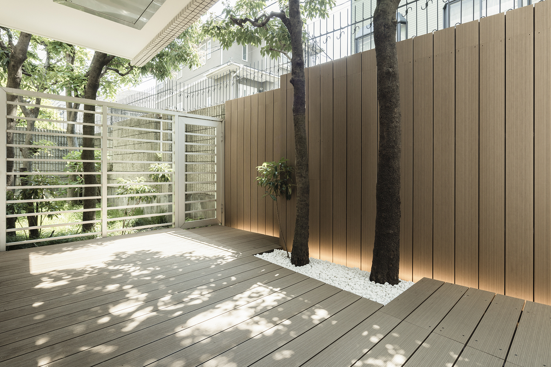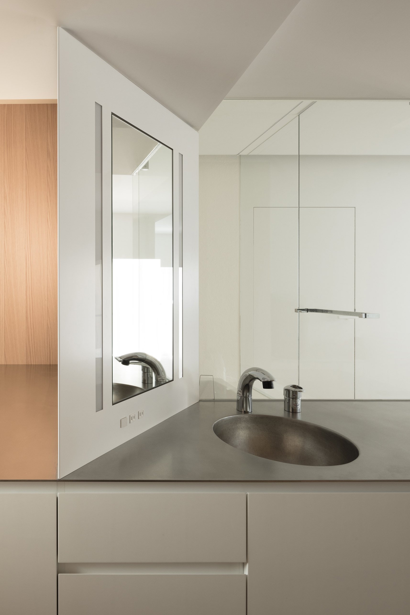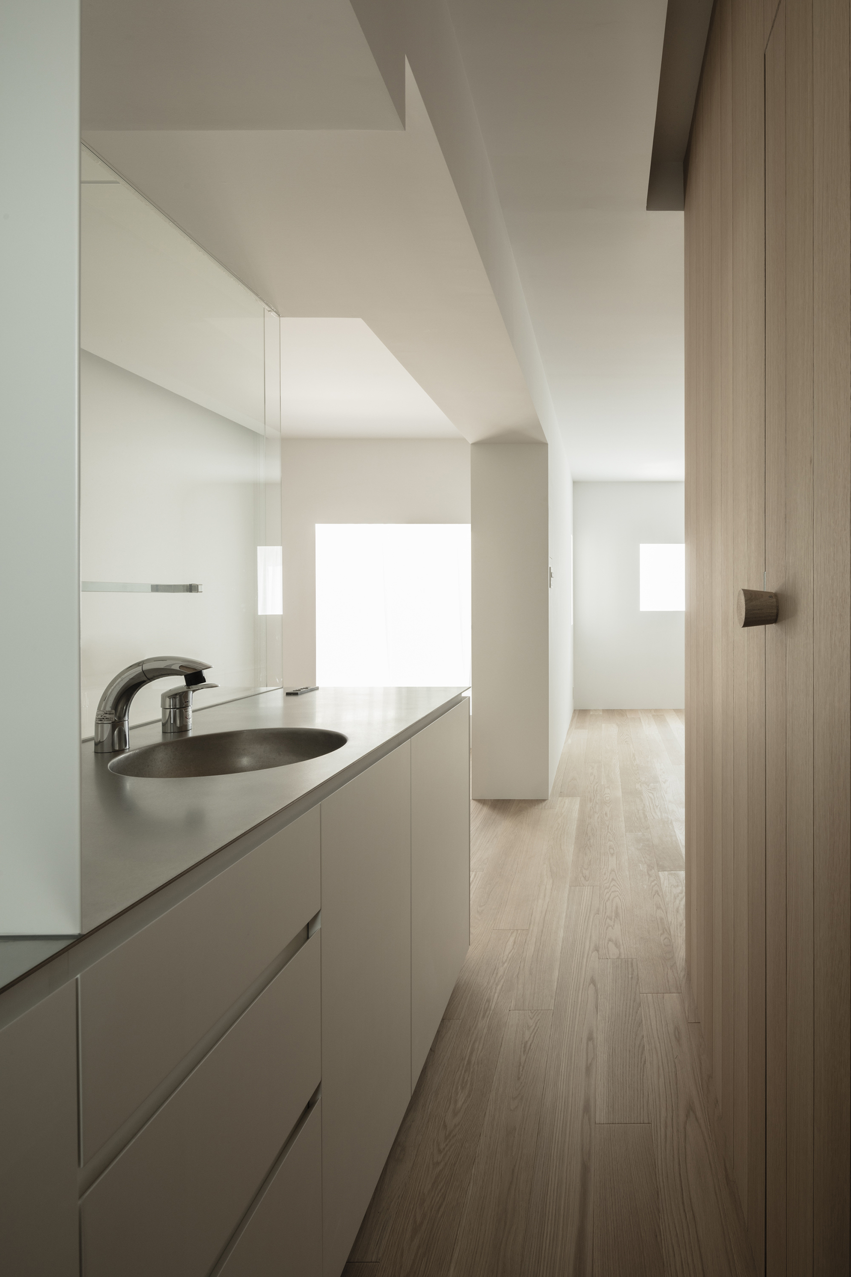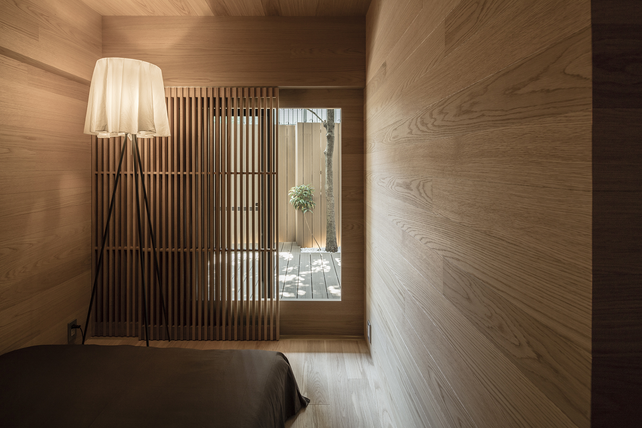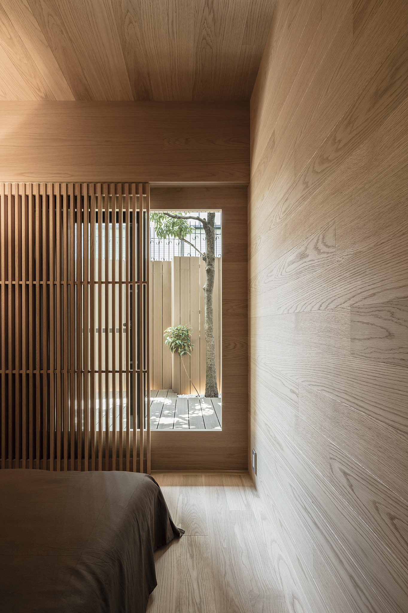 寝室は白く無機質な空間とは対照的に、自然素材の風合いをより感じられるよう、柾目と板目を混ぜ合わせたナラの木で全体を包み込んだ。
