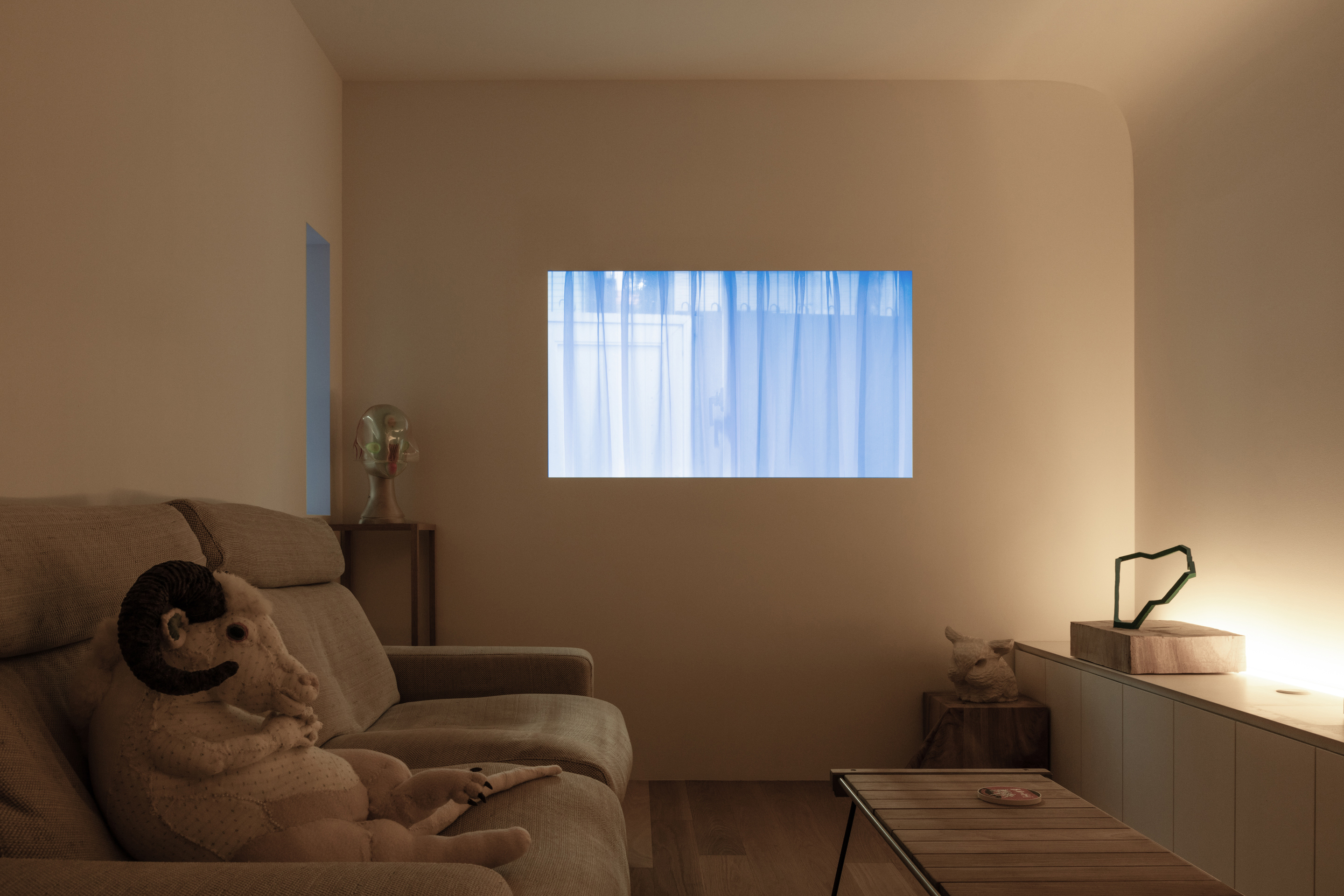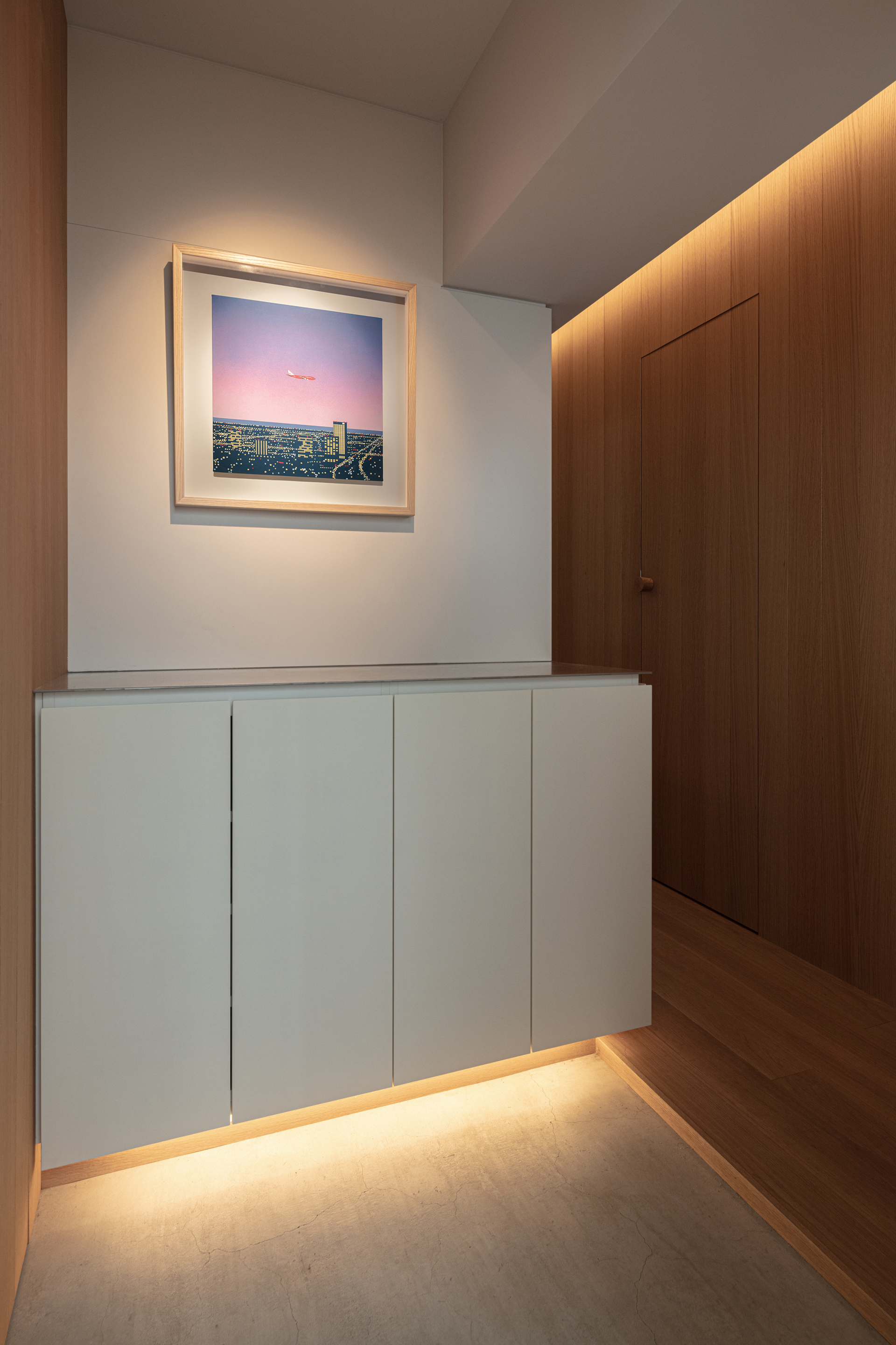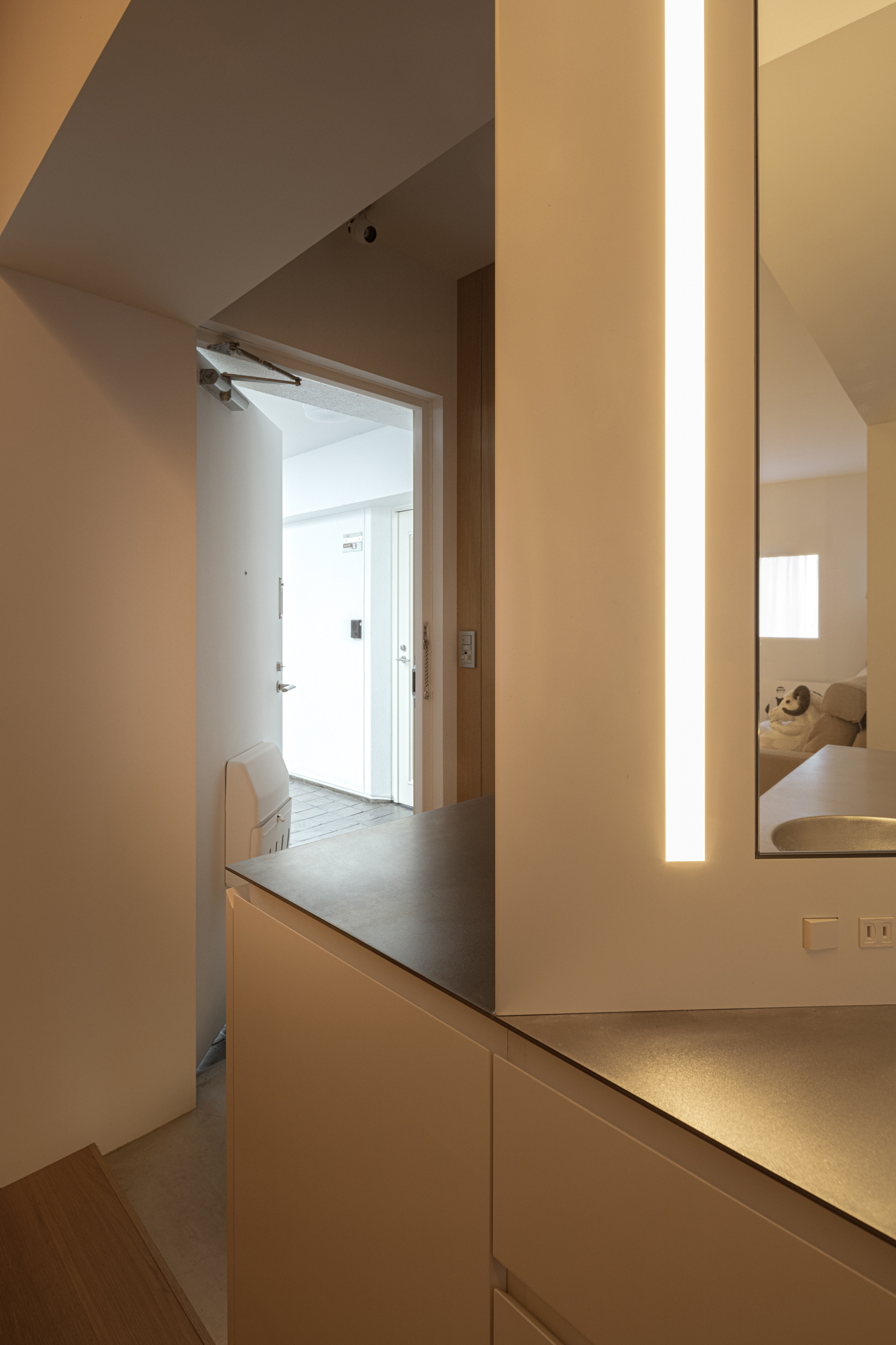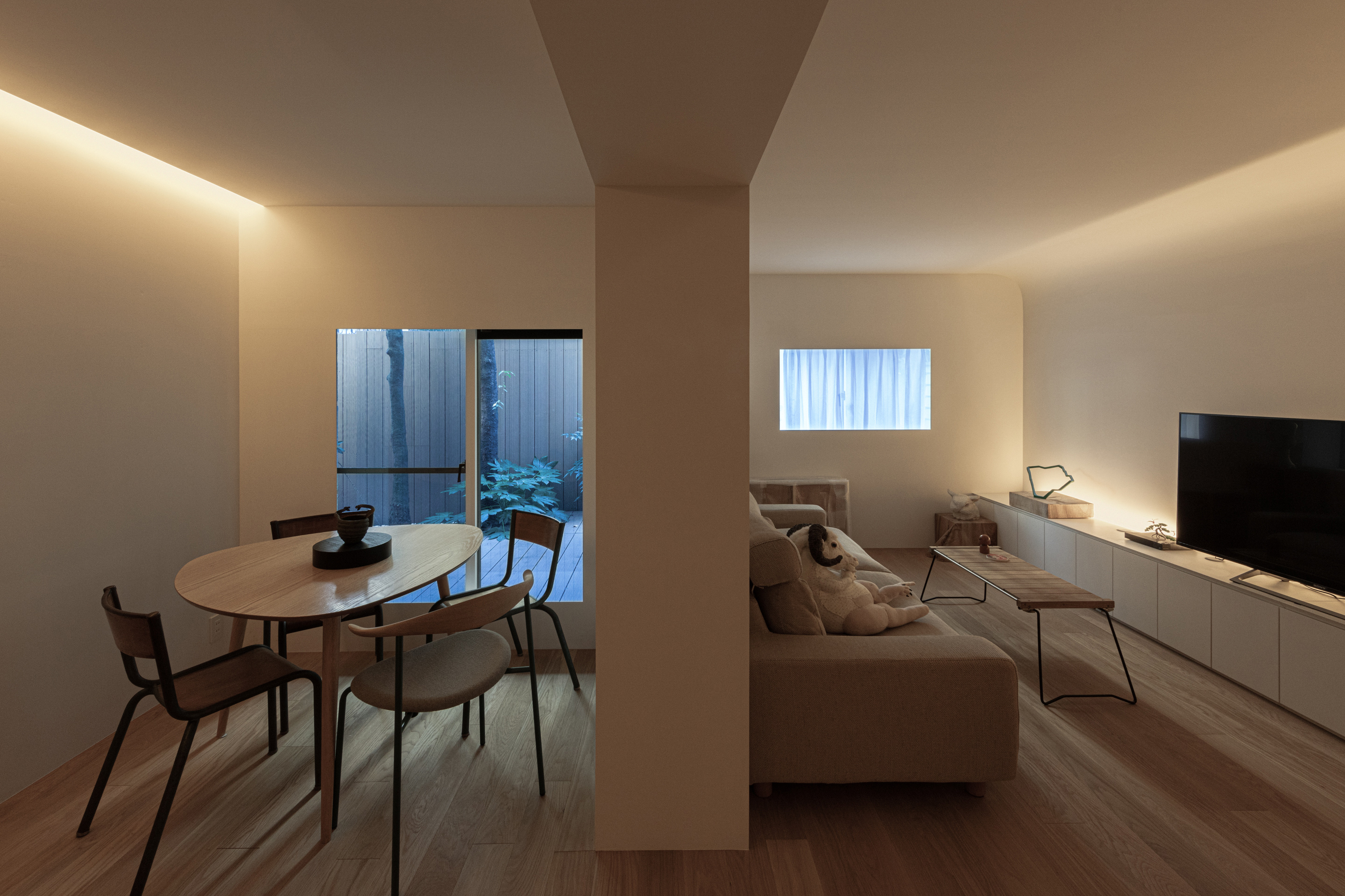 凹凸の出ない空間へと整えることで、途切れの無いコーニス照明を作り出す。この分節のない伸びのある光で空間を大らかに包み込むことで、居住空間としての温かみも共存させたいと考えた。