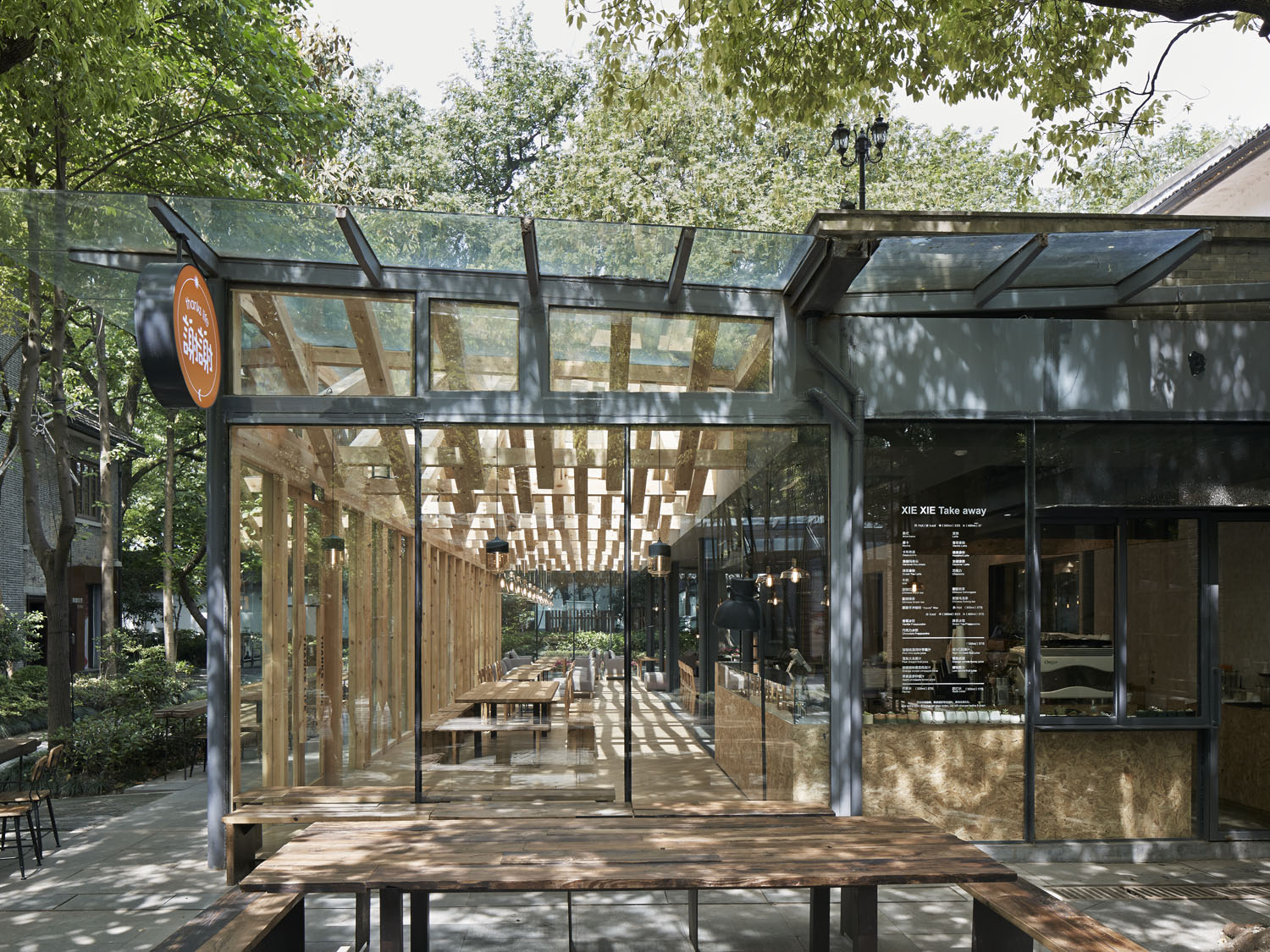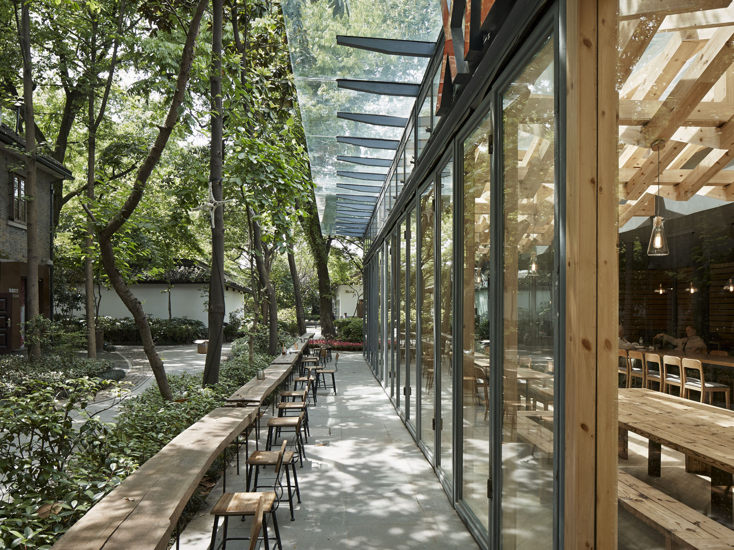 如果说西湖天地的主角是外部景观的话,从外部通过透明的玻璃看到如同漂浮的木梁遮阳架(凉棚),如同看见公园内的休息区,内部空间与周围的环境融为一体。