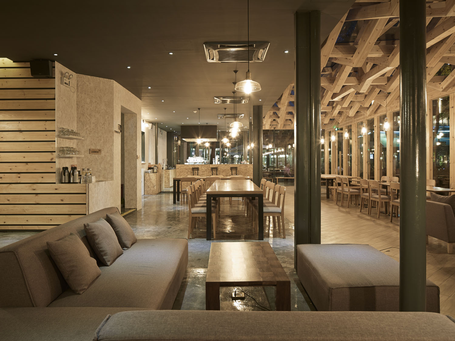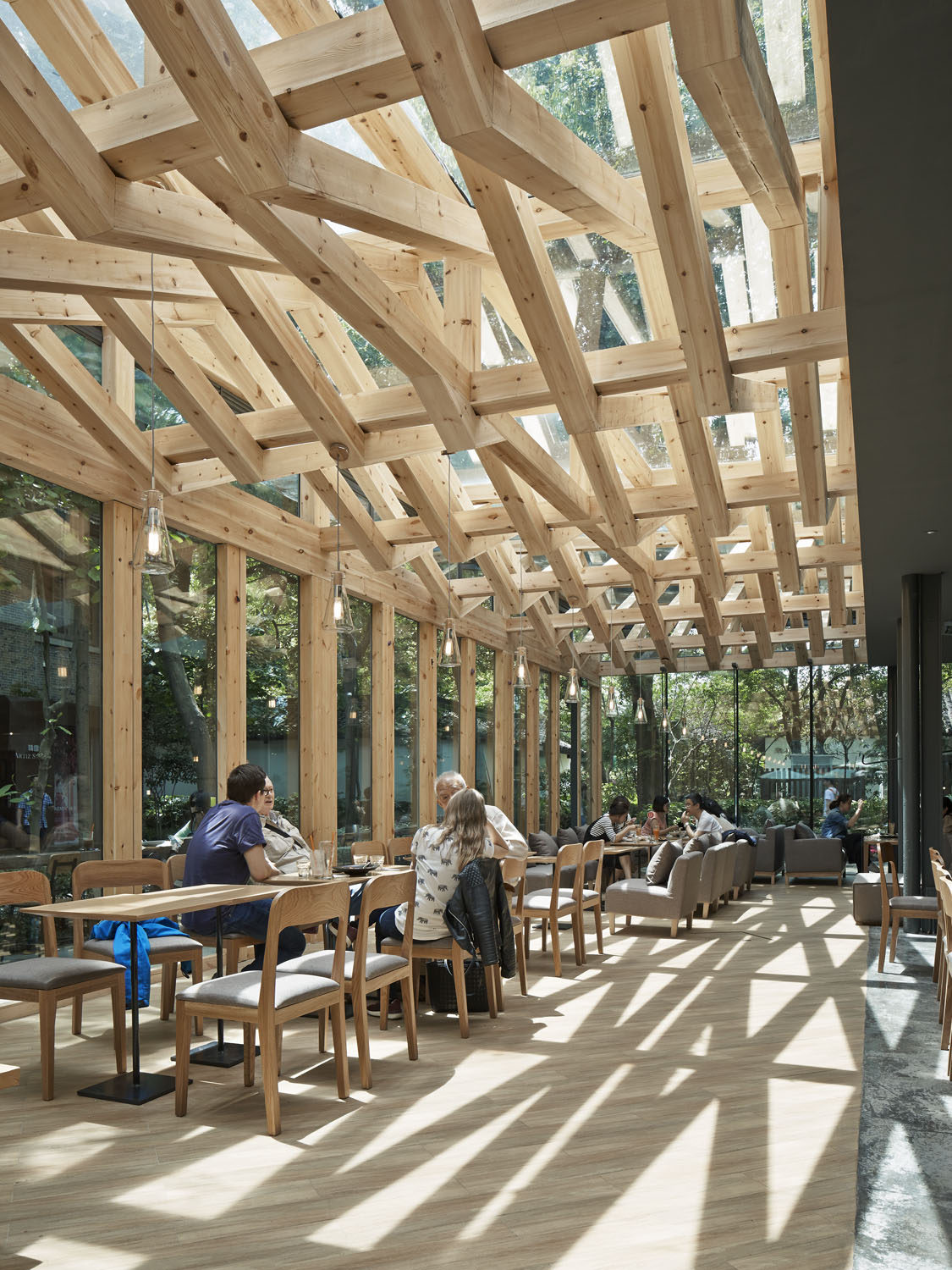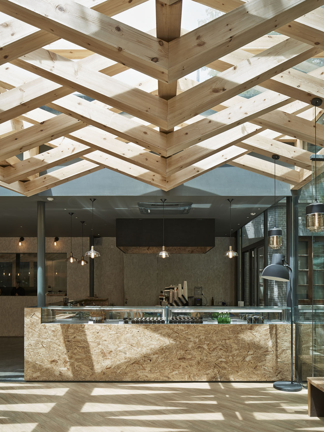 玻璃空间里,保留所有玻璃屋顶的双层方管钢梁结构,我们利用结构本身的序列节奏加上新增木梁,形成有趣的斜面编织纹理。新增木梁在原有结构之间穿行而过,利用木质的温暖性营造咖啡店舒适及有趣的空间体验。