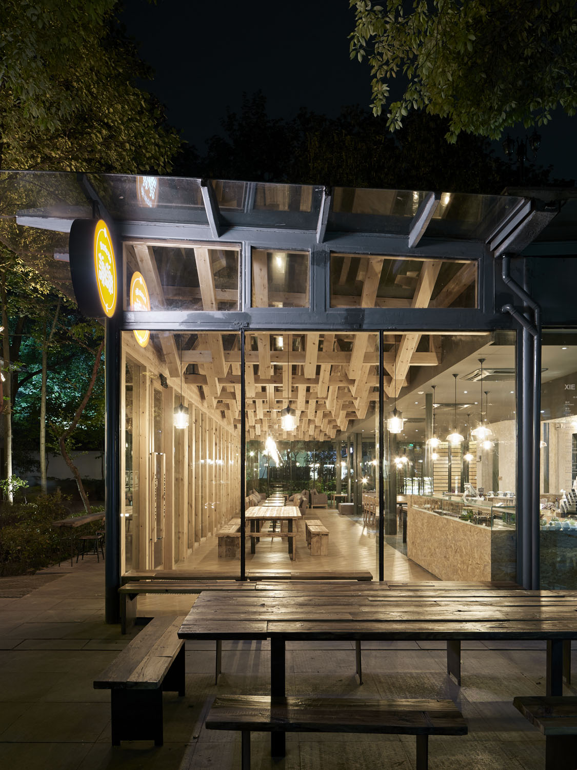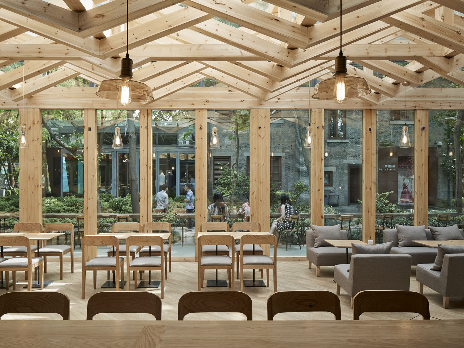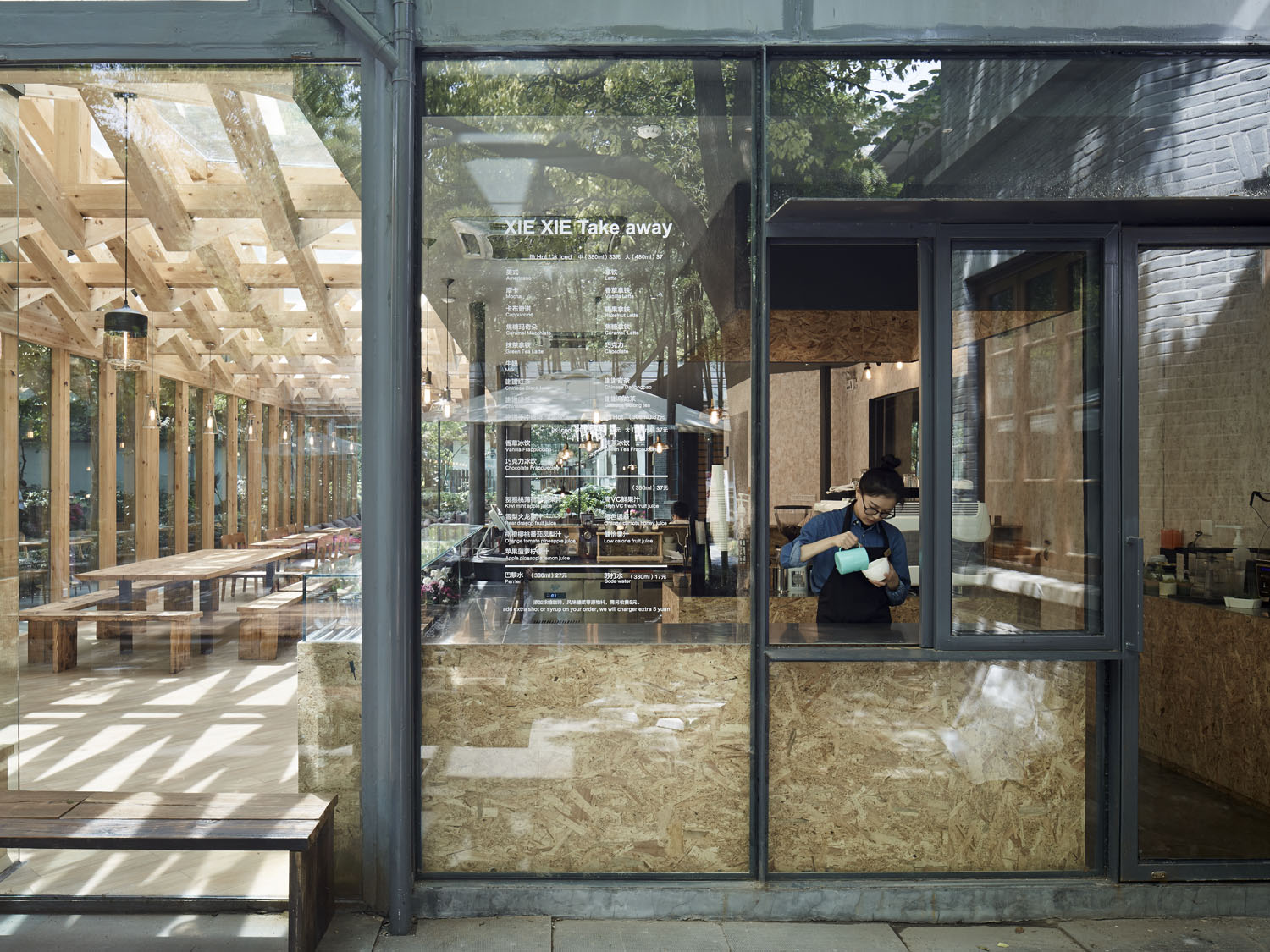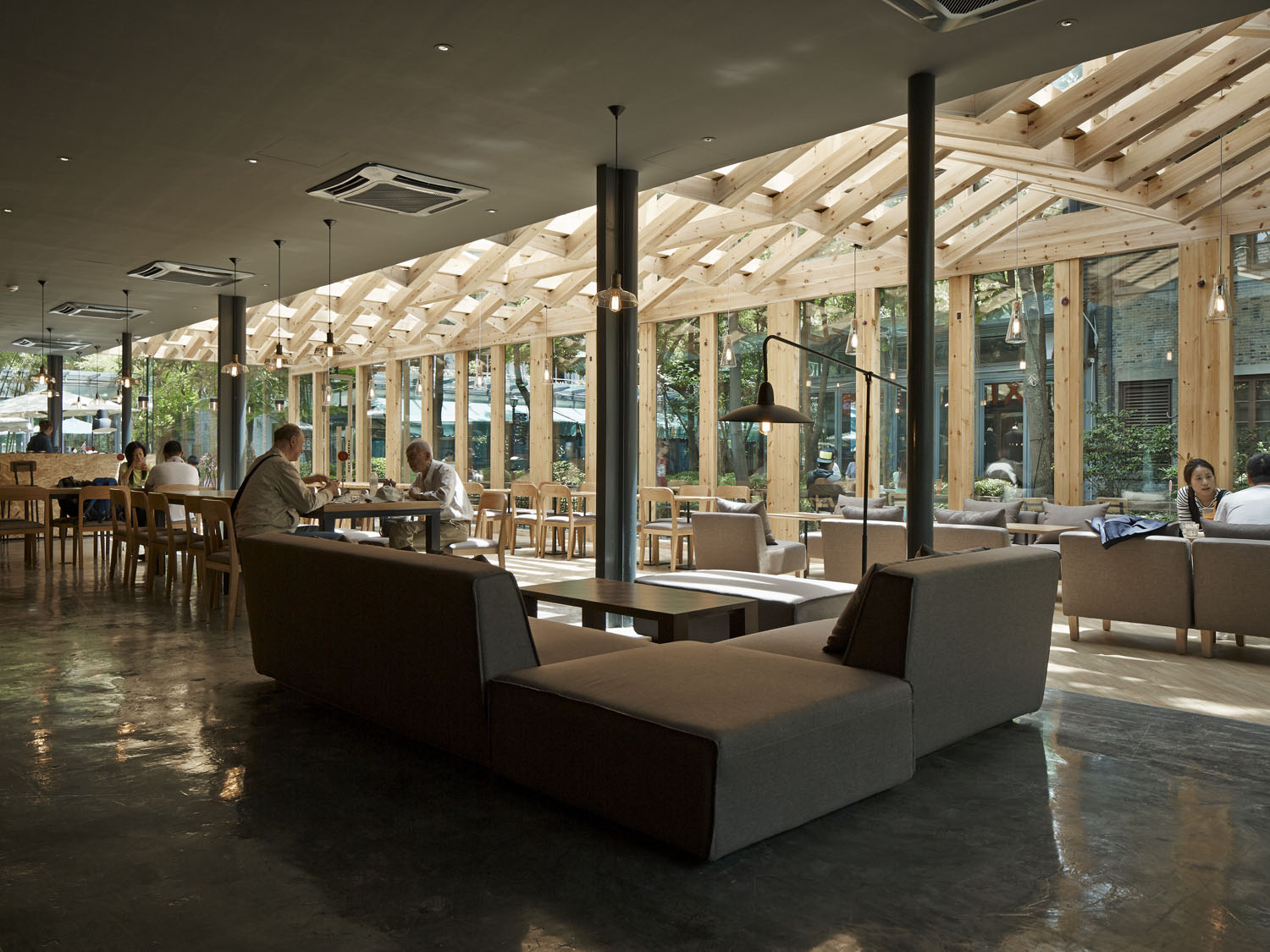 玻璃空间里,保留所有玻璃屋顶的双层方管钢梁结构,我们利用结构本身的序列节奏加上新增木梁,形成有趣的斜面编织纹理。新增木梁在原有结构之间穿行而过,利用木质的温暖性营造咖啡店舒适及有趣的空间体验。