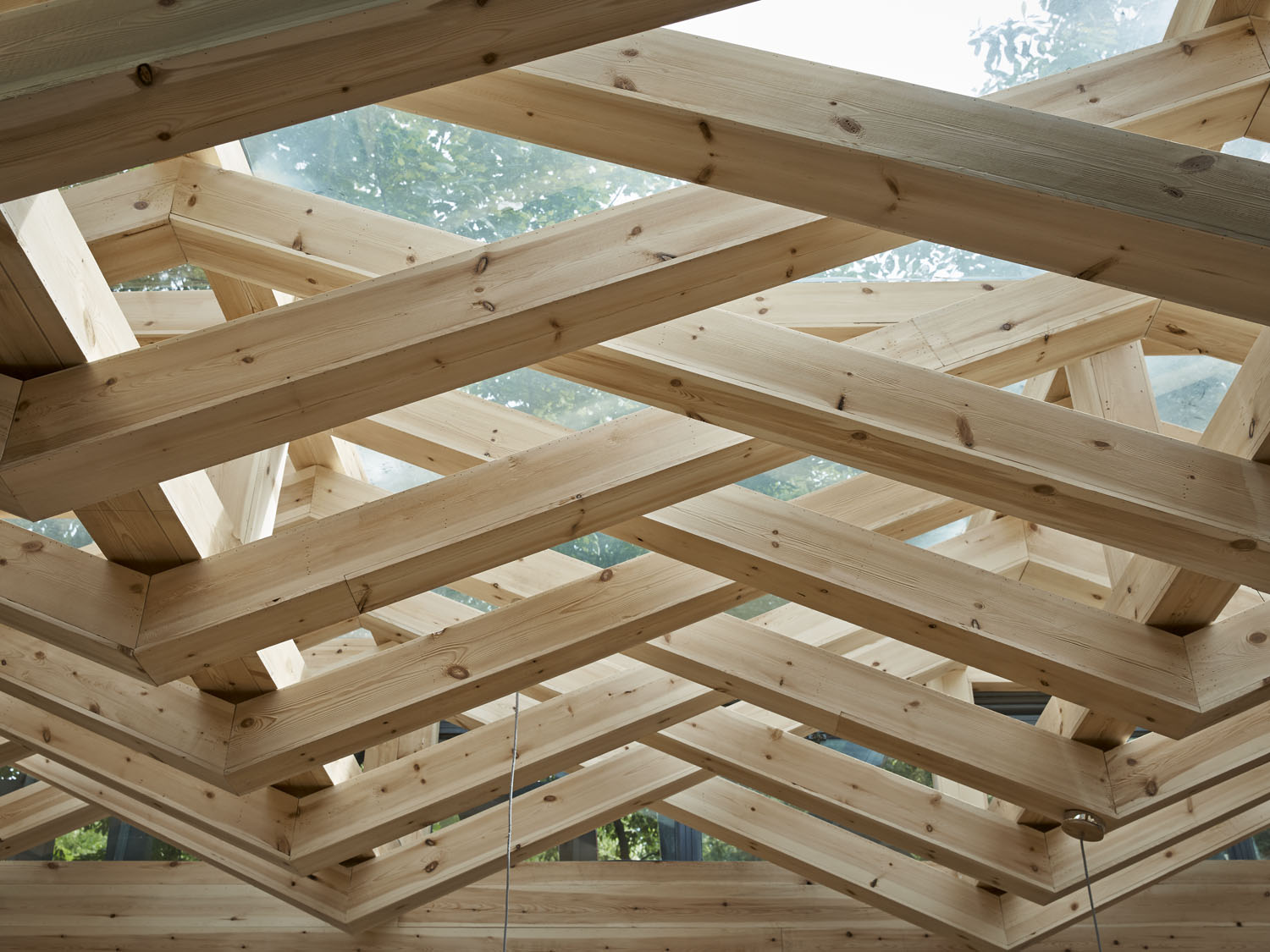 サンルーム空間は、ガラスを支えている既存のダブルビームのリズム感に注目をし、それらの構造は全て残しつつ、木をその梁に斜めに編み込むことで、空間に木の温もりを与えると同時に、カフェに相応しい遊び心も加味したいと考えた。