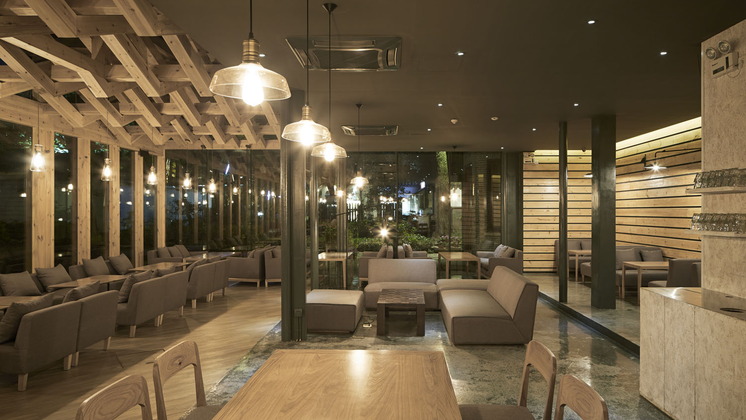We kept all the double beam structure under the glass. In this warm space, we preserved and followed the form of the existing structure while adding additional wooden beams to create interesting weave patterns. The wood beam passing through the original structure, the materiality of wood creates a warm and cozy atmosphere of a coffee shop.
