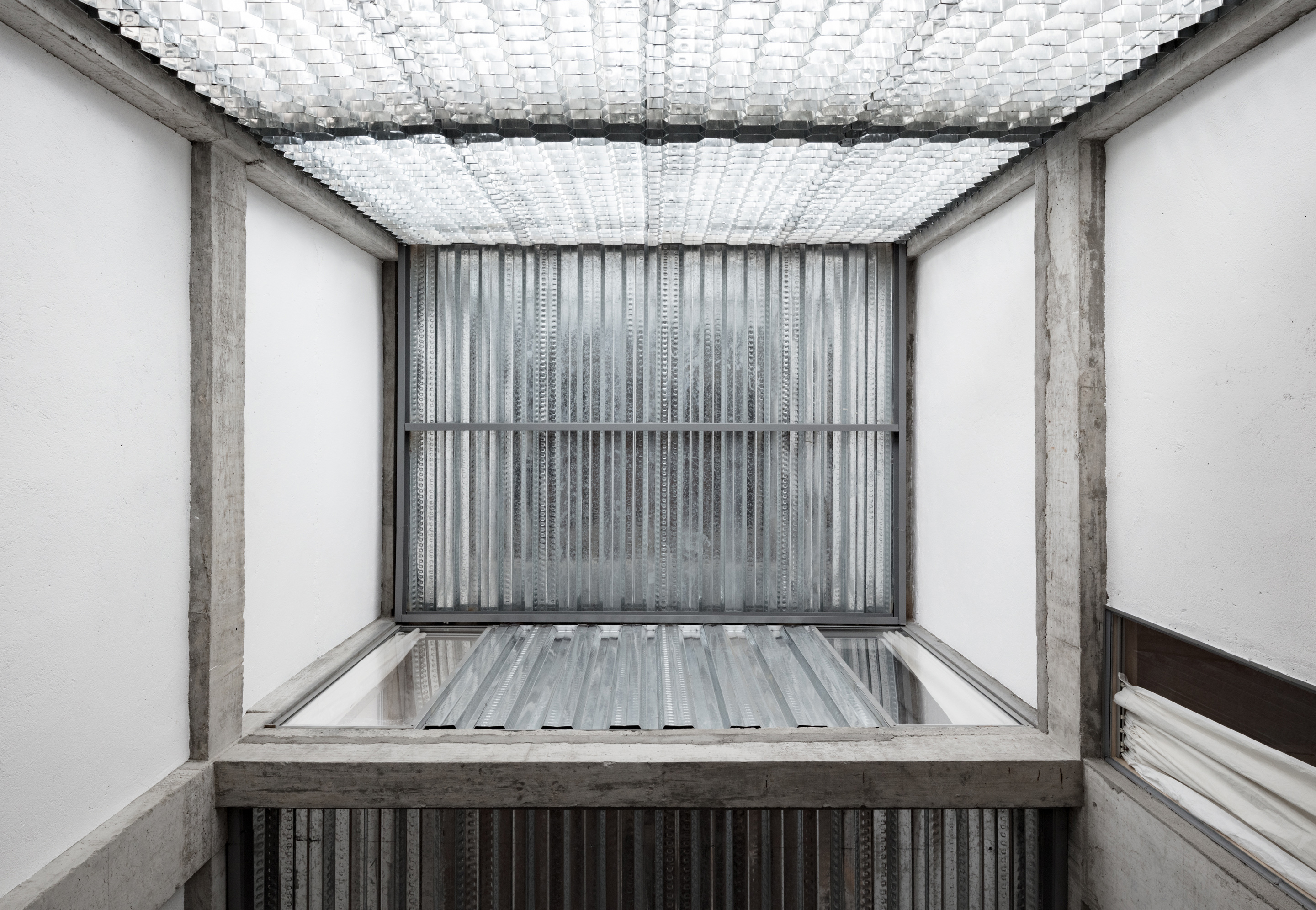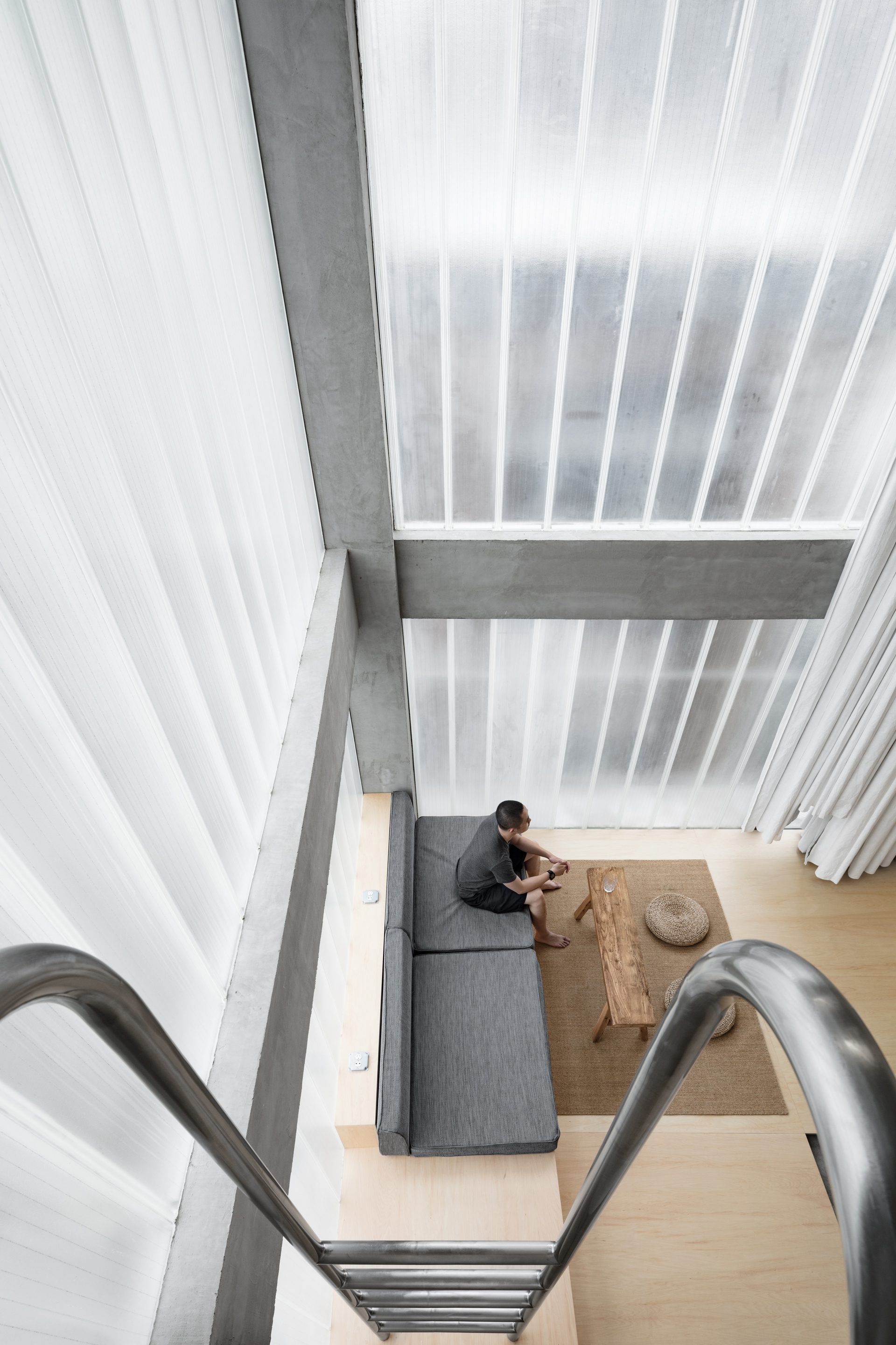 The project began with bare column and beam structures. The standard floor is divided into a four-room layout. The bedrooms and the wet area are separated into upper and lower floors, and the double story living room introduces a frosted channel glass façade, which acts as insulation while bringing in natural light and avoiding direct sightline to neighboring buildings.