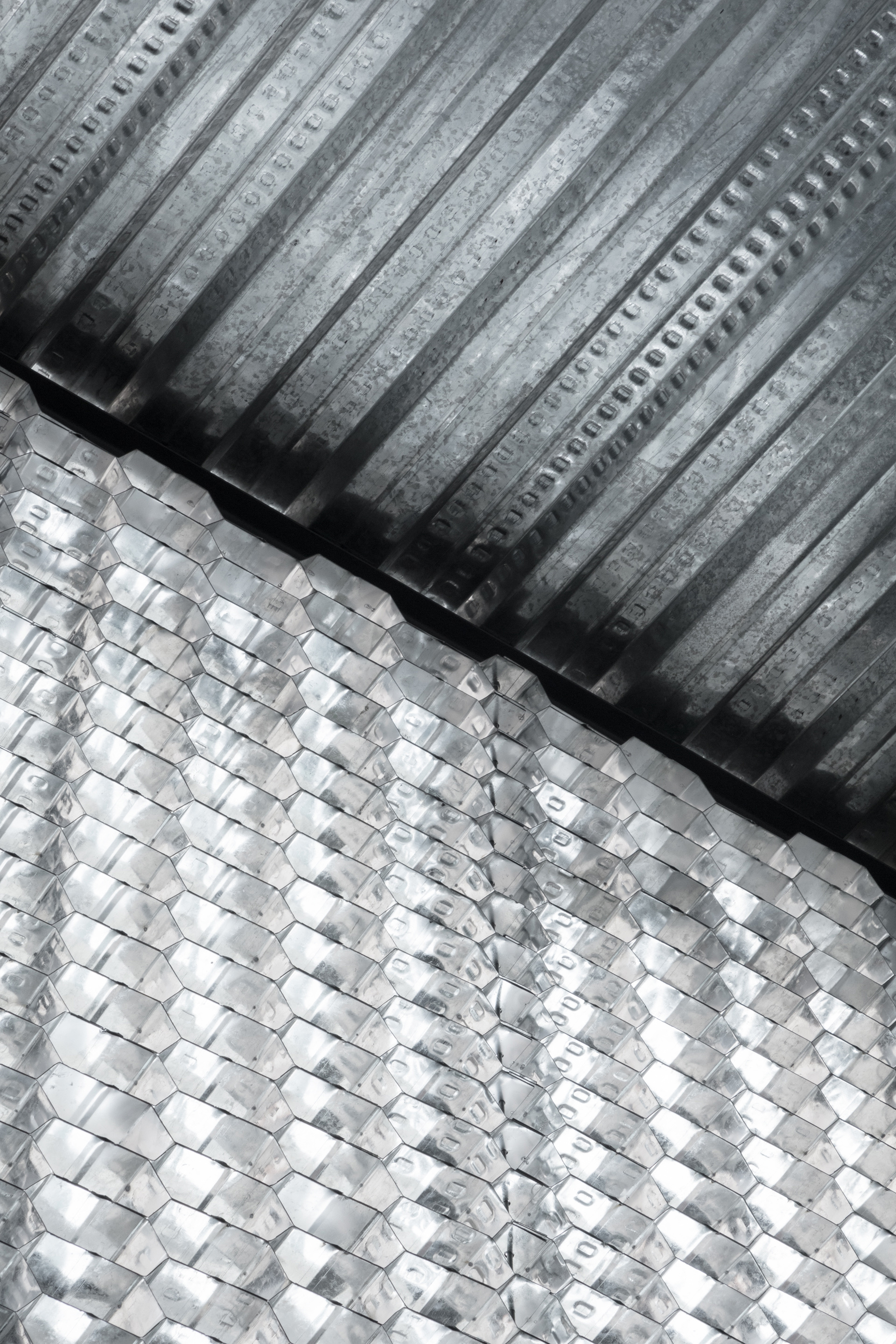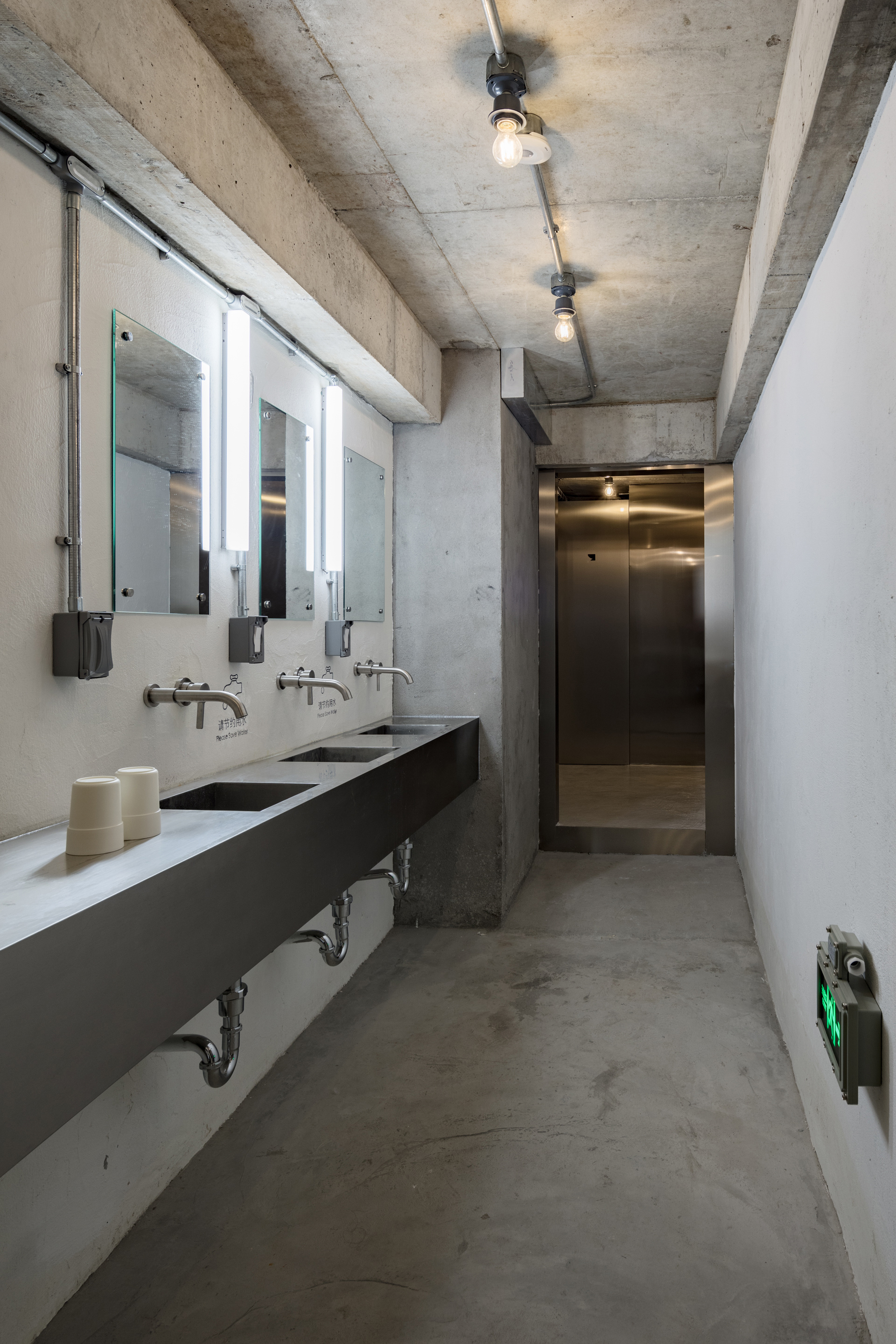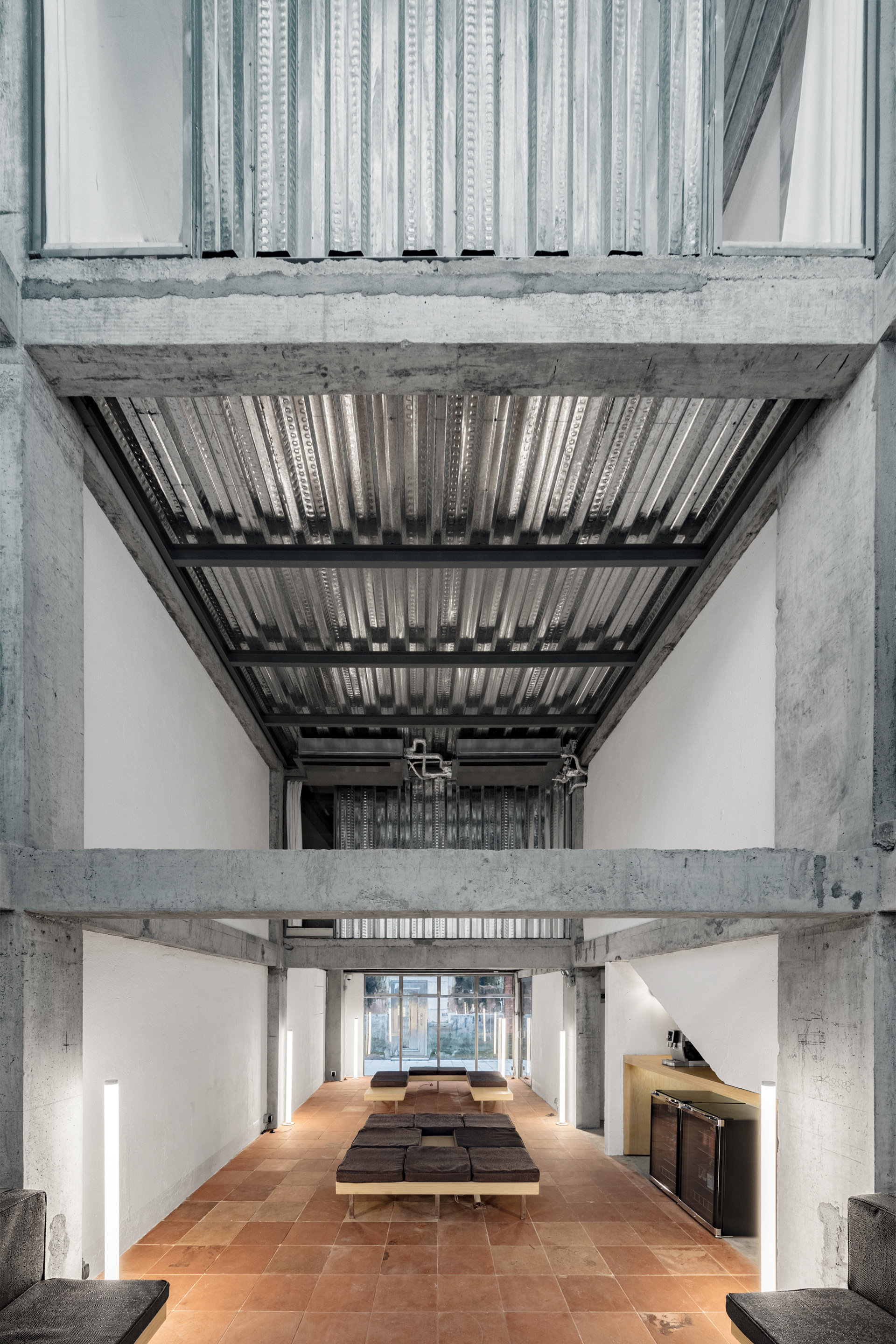 One wall of the first-floor lobby is made with 120mm long strips of sliced galvanized steel deck. Natural light passes through parallelly stacked steel deck and reflects softly diffused light to welcome the guests.