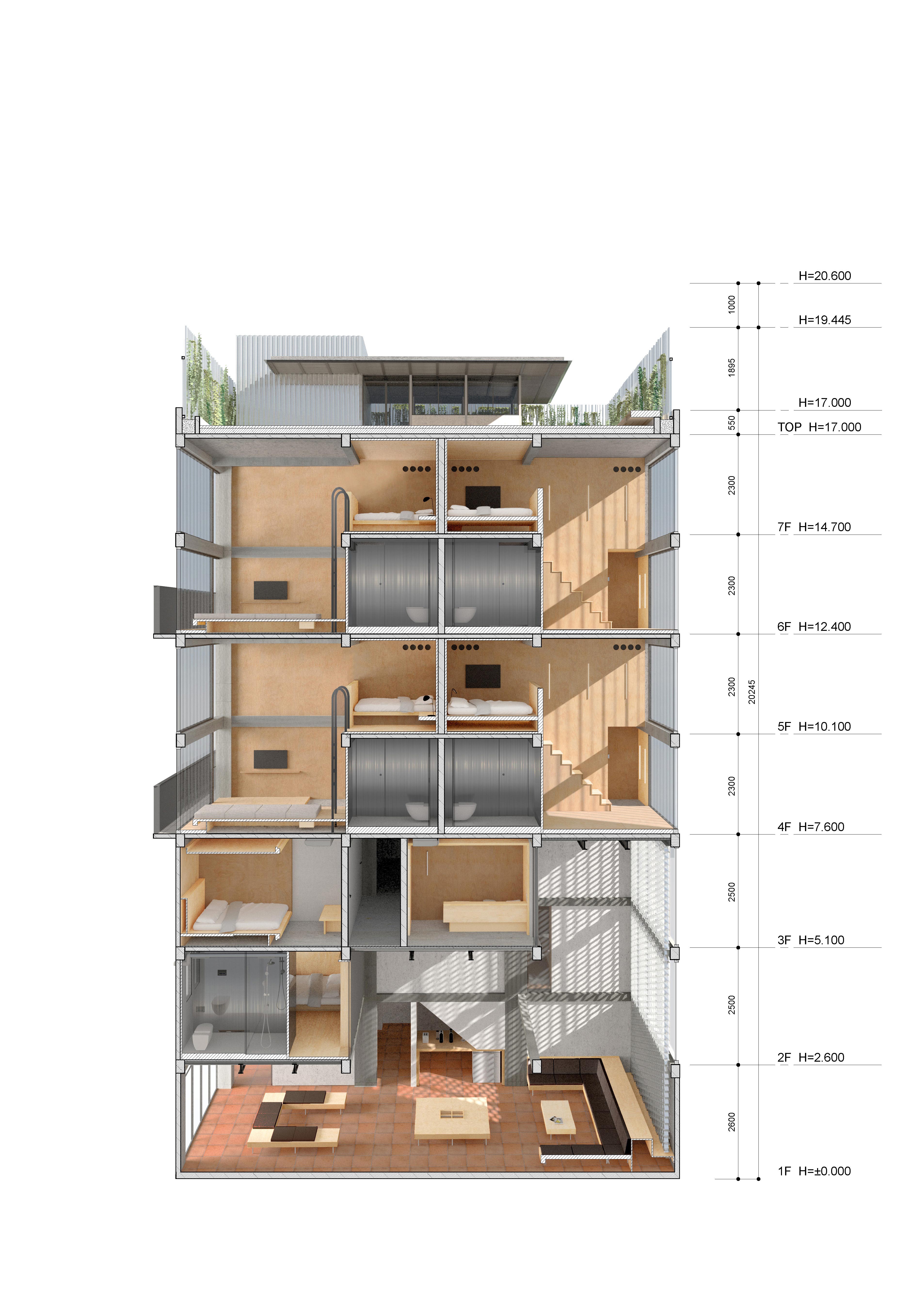 まず私たちは既存躯体の特徴を調査し、1フロアを4つの客室として計画をした。水周りと寝室を上下階にコンパクトに計画し、2層吹き抜けのリビングにはぼかしがかったUチャネルガラスを採用することで、遮音、断熱、自然光を確保しながら、周囲とのプライバイシーを獲得した。