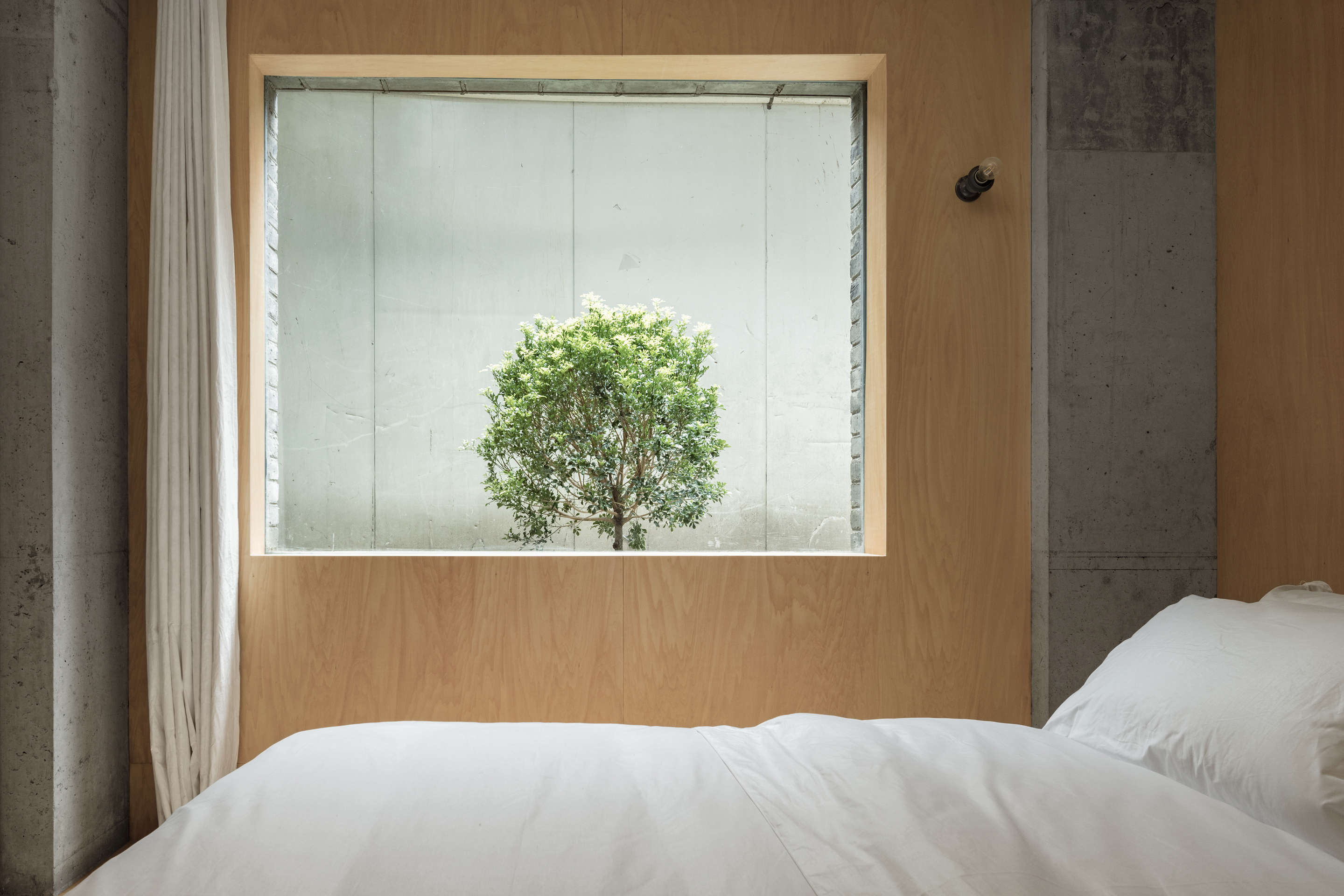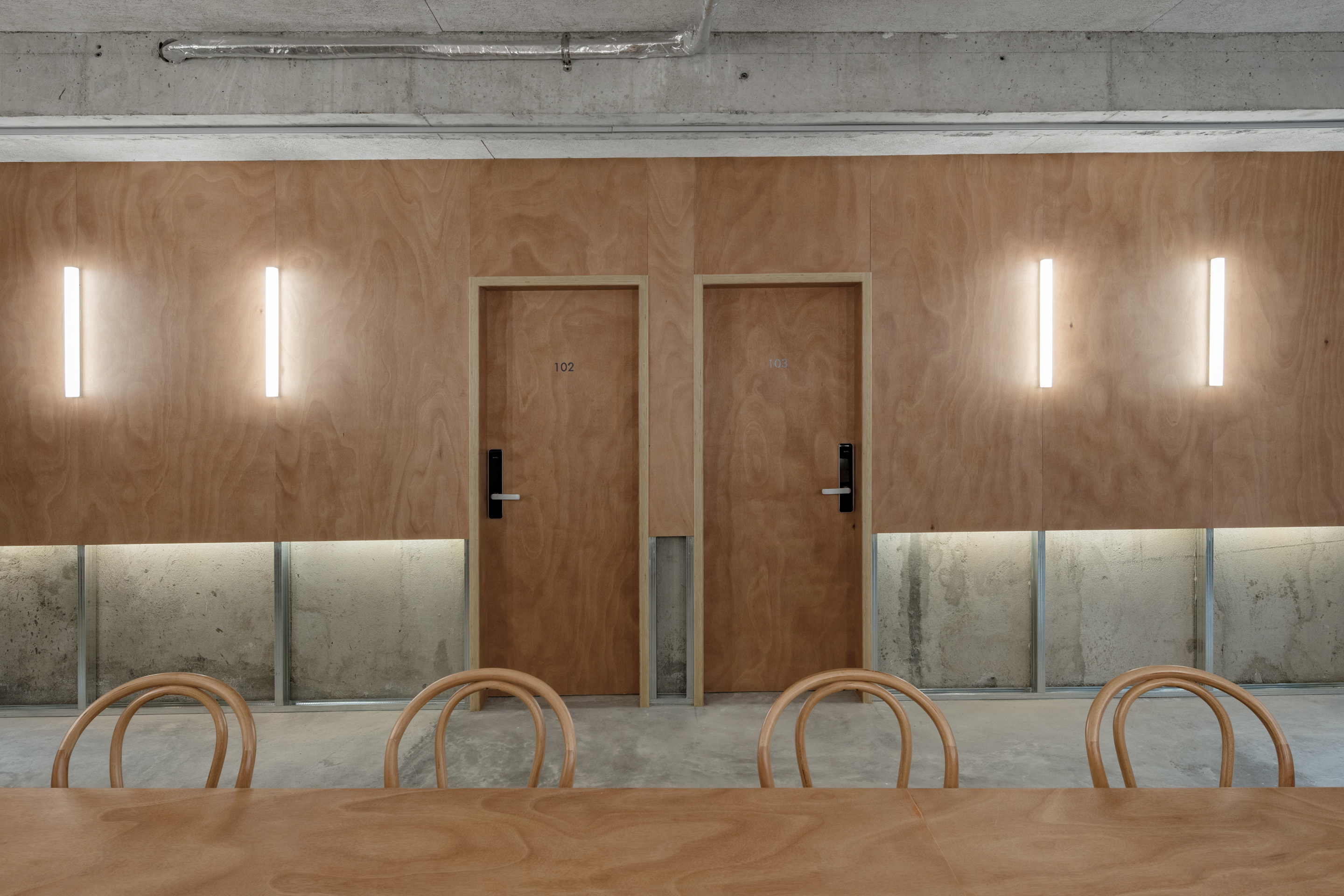 室内原有梁、柱等混凝土结构干净、简单。为保留原有混凝土结构本身的美感,我们尝试将原有建筑物的混凝土结构裸露出来作为室内设计的一部分,挑选椴木胶合板作为客房室内的材料,在公共区域则使用了柳桉胶合板来突出混凝土结构。兼具自然与美感,又实现了最低成本的室内设计。