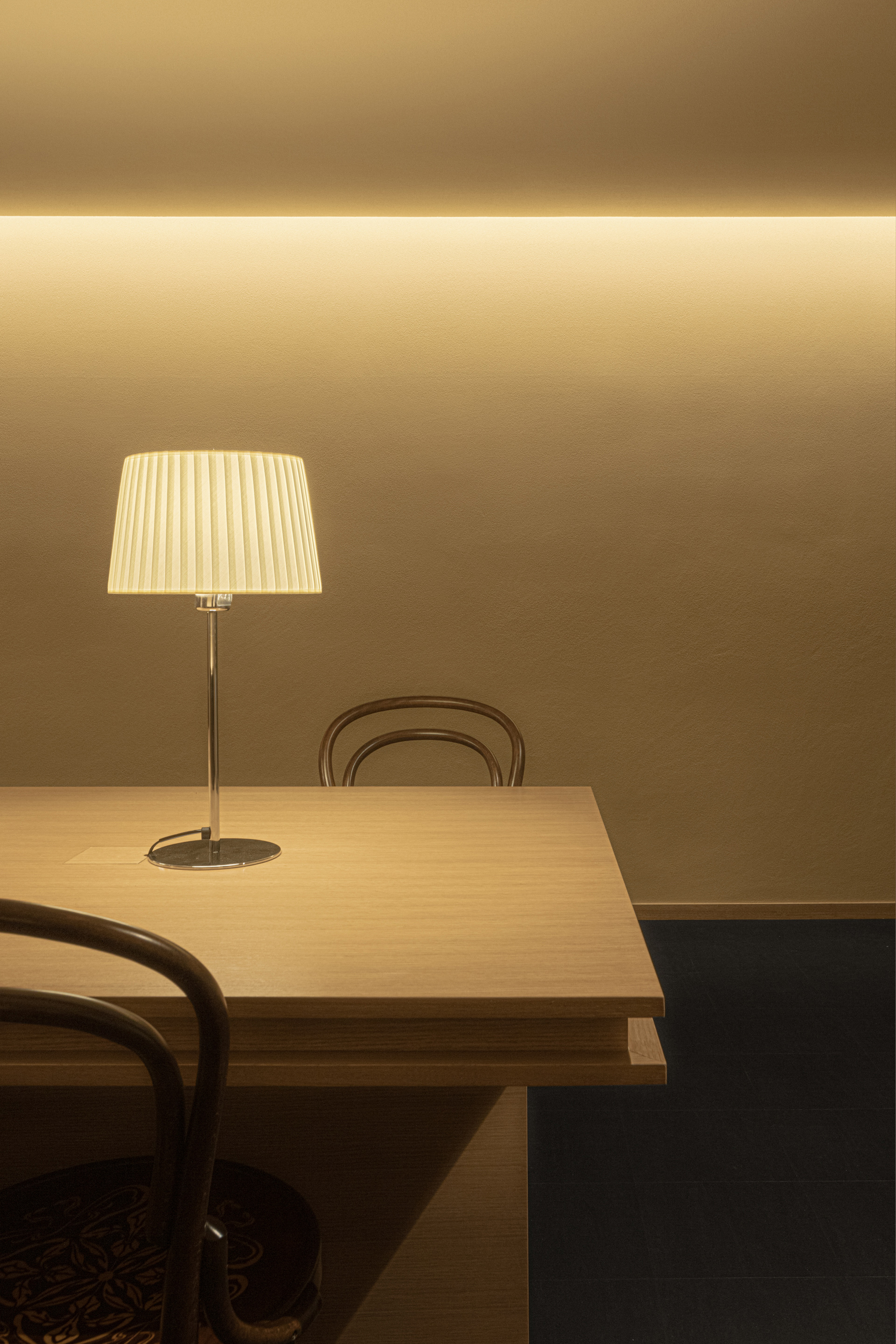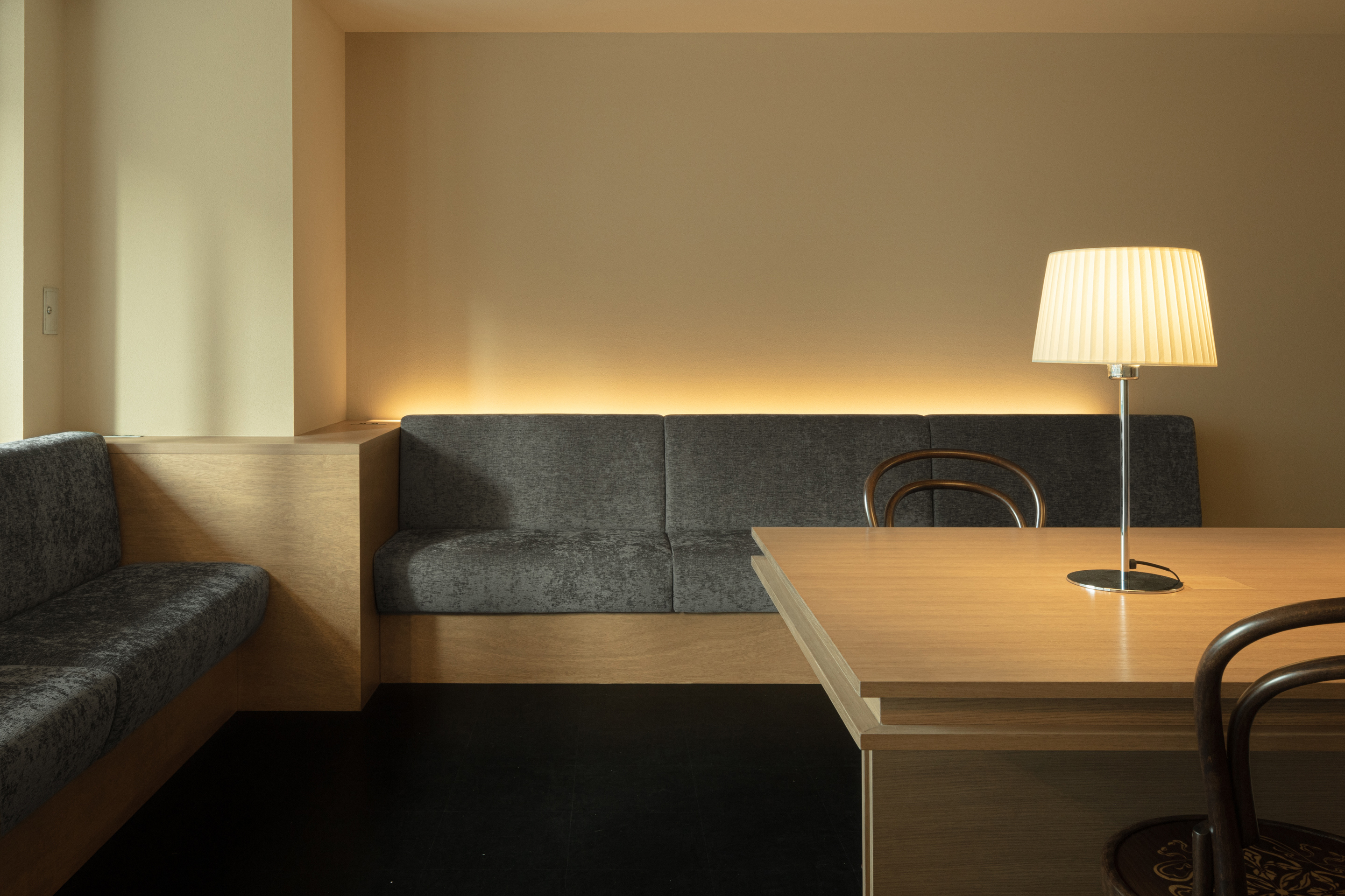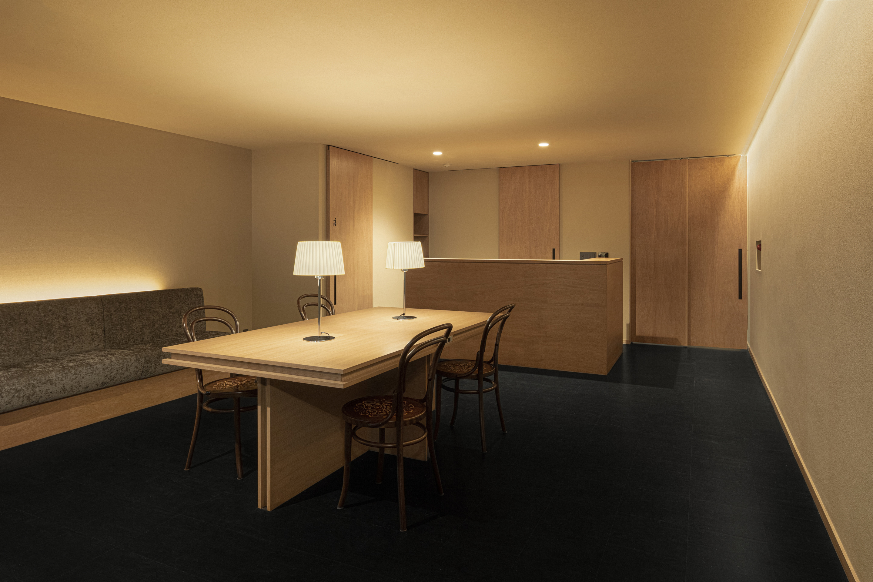 这些灯光的柔晕映射在具有湿度调节功能的手工硅藻泥墙面上,带来细致的光影效果。