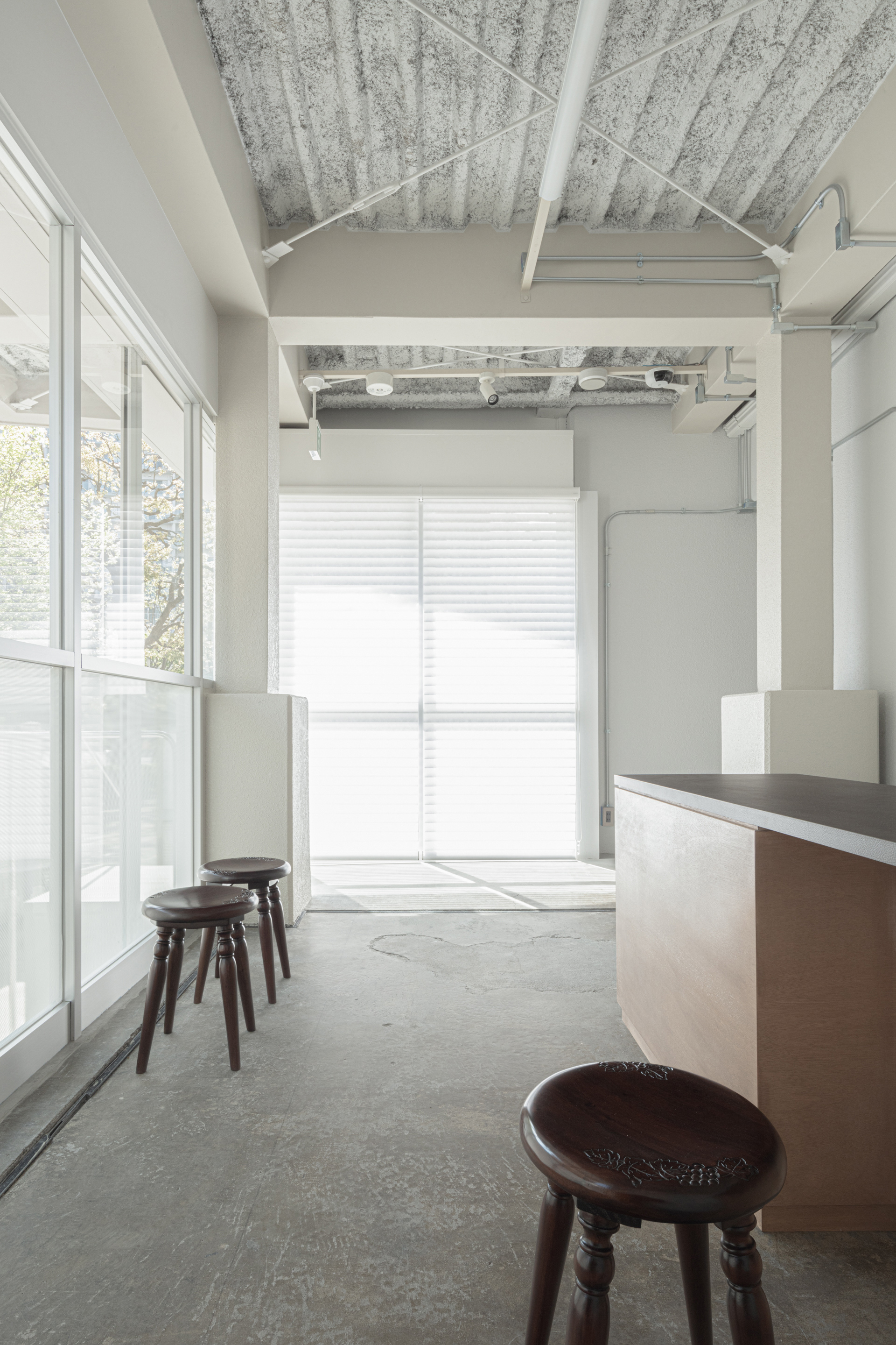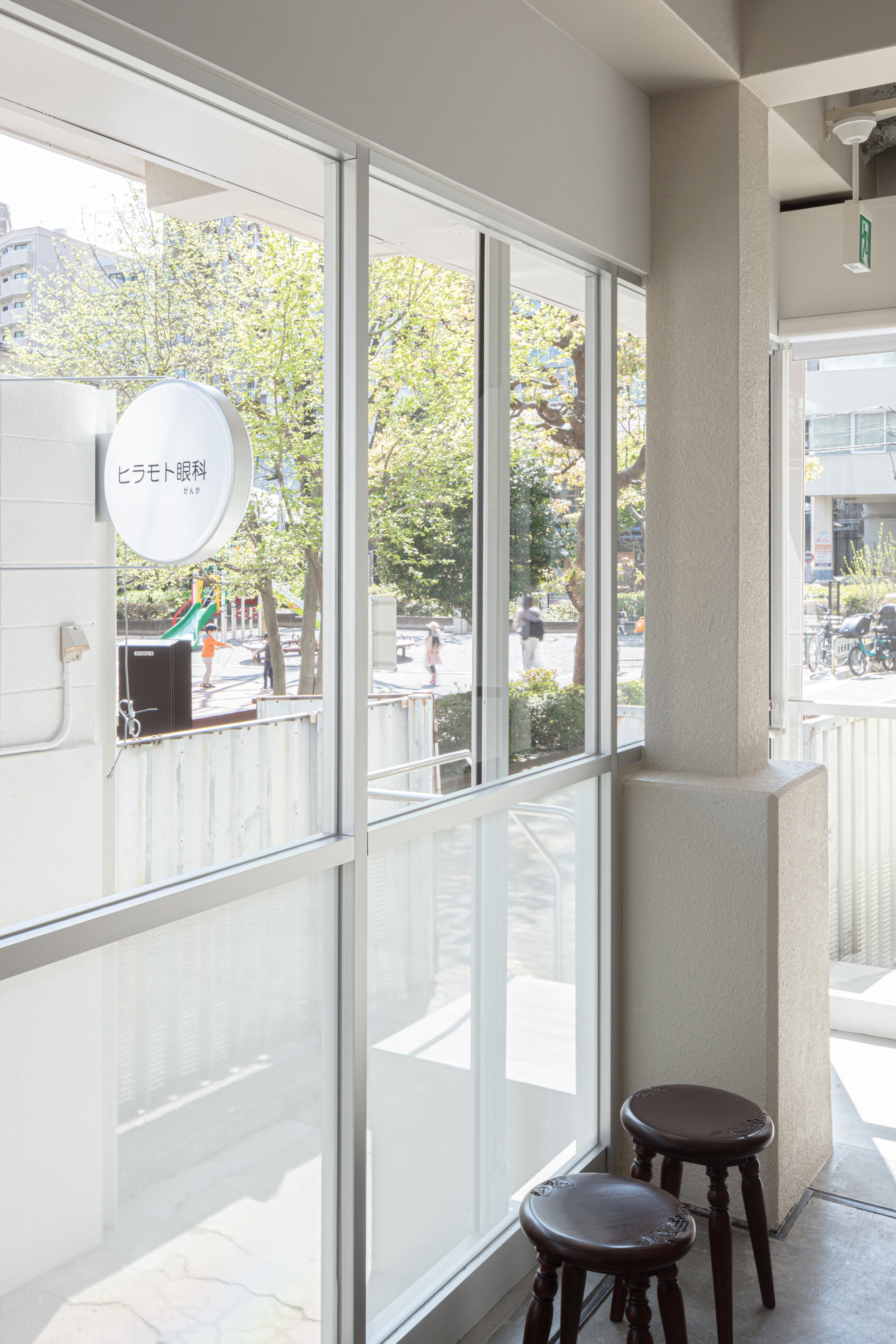 空間は眼に悩みを持つ患者さんに優しい光となるように、コーニス照明や手元照明を中心に計画した。調光機能やシェードを使うことで患者さんの目に負担をかけない、過剰に明るくなり過ぎない光とした。