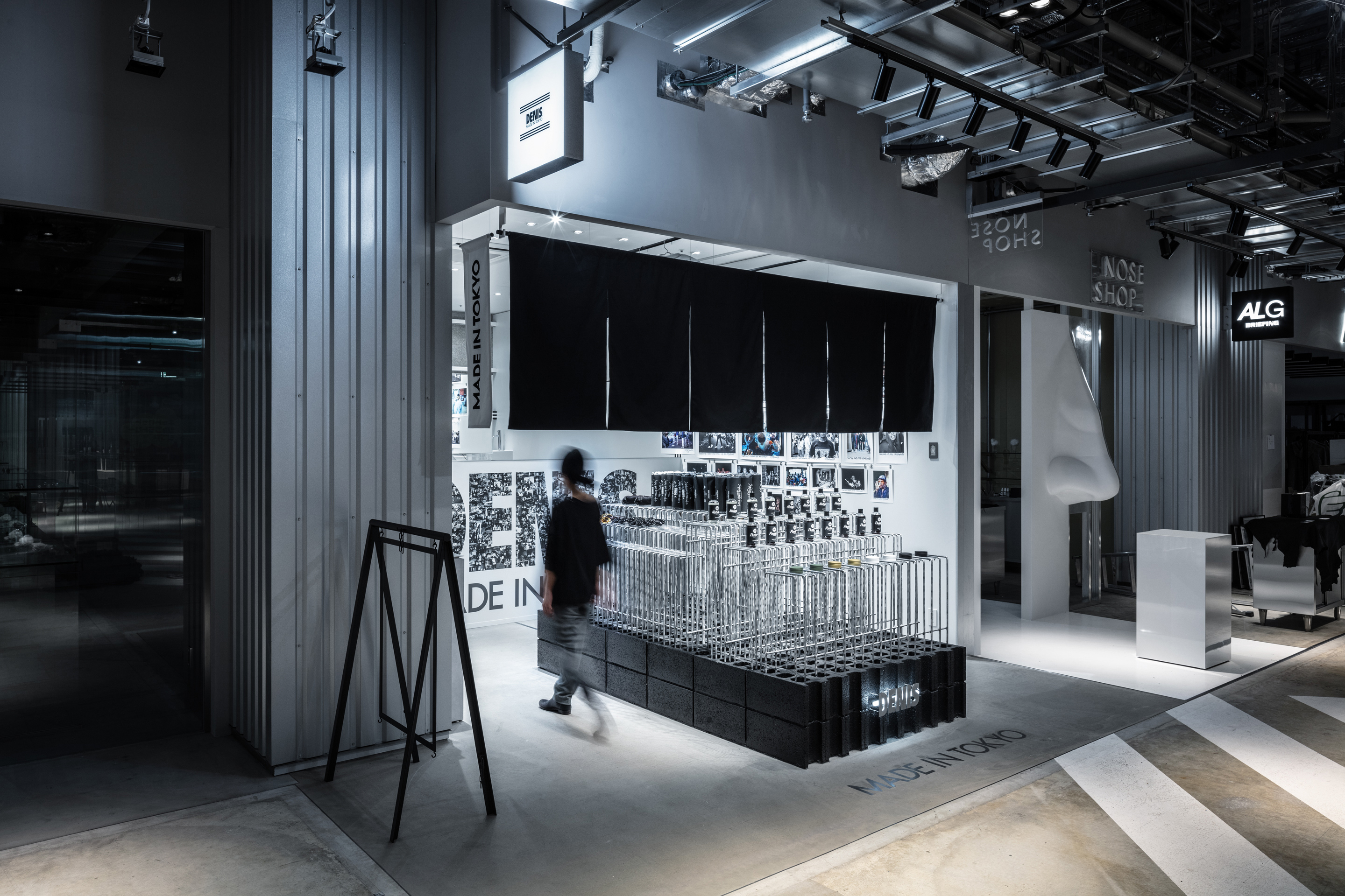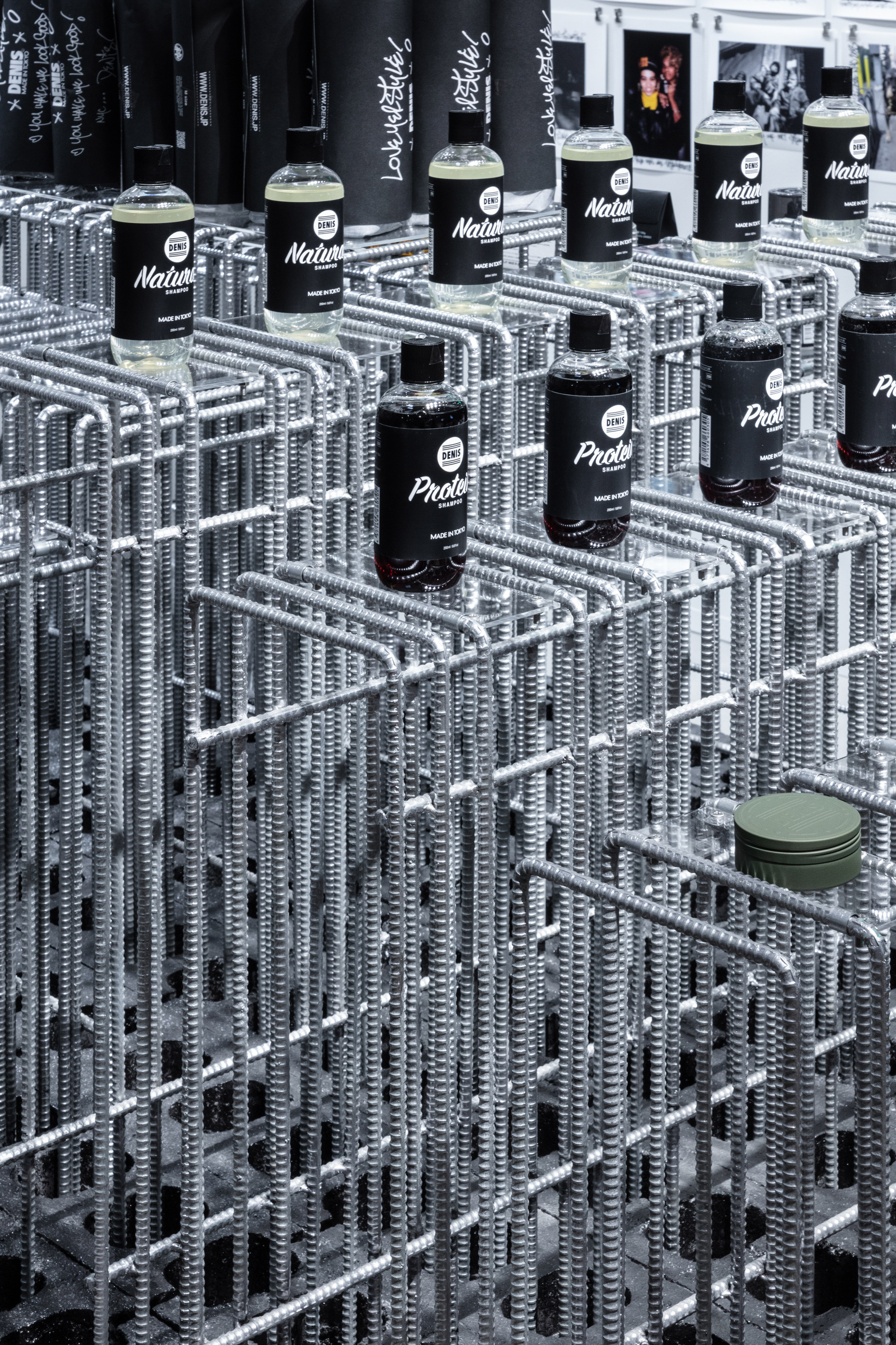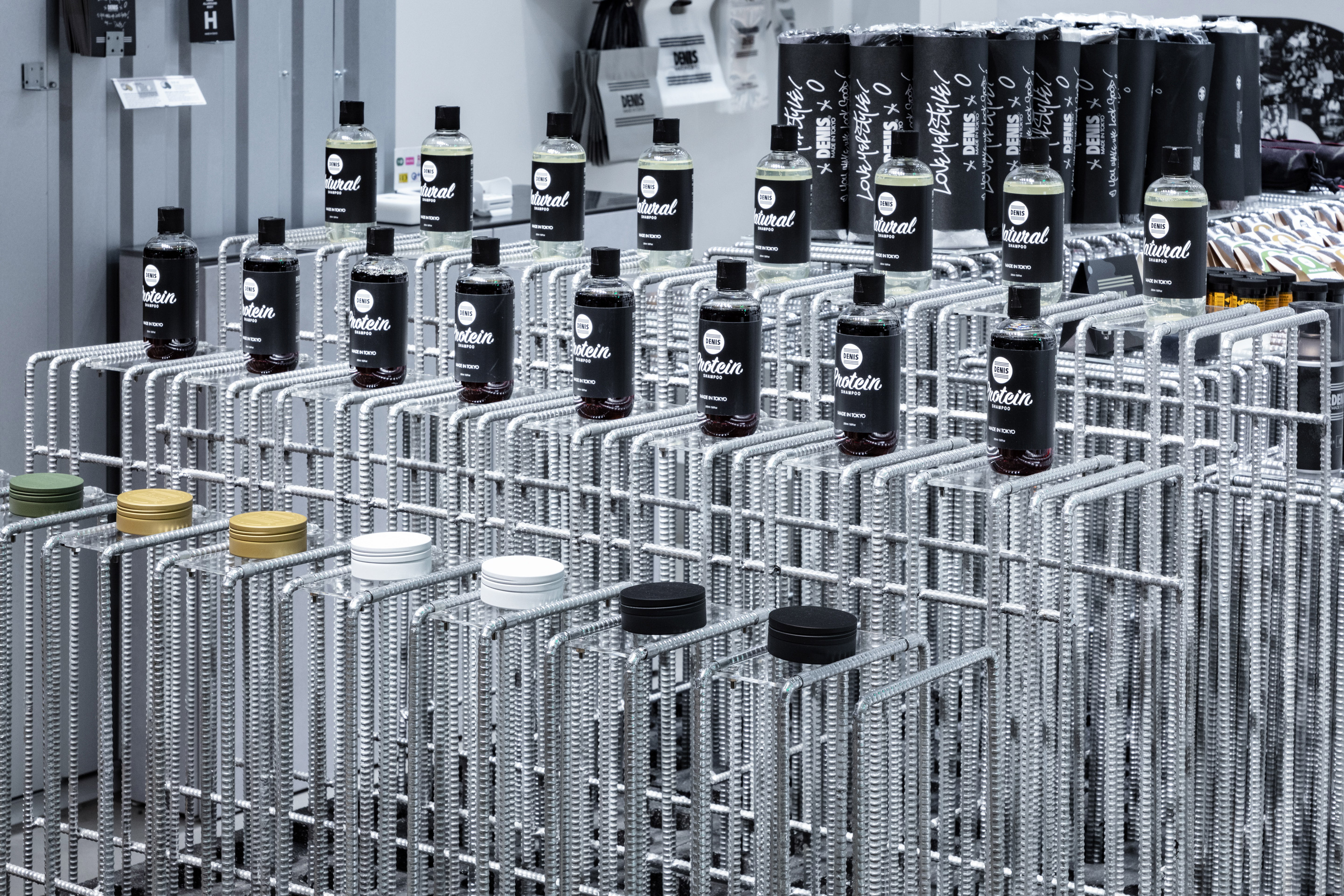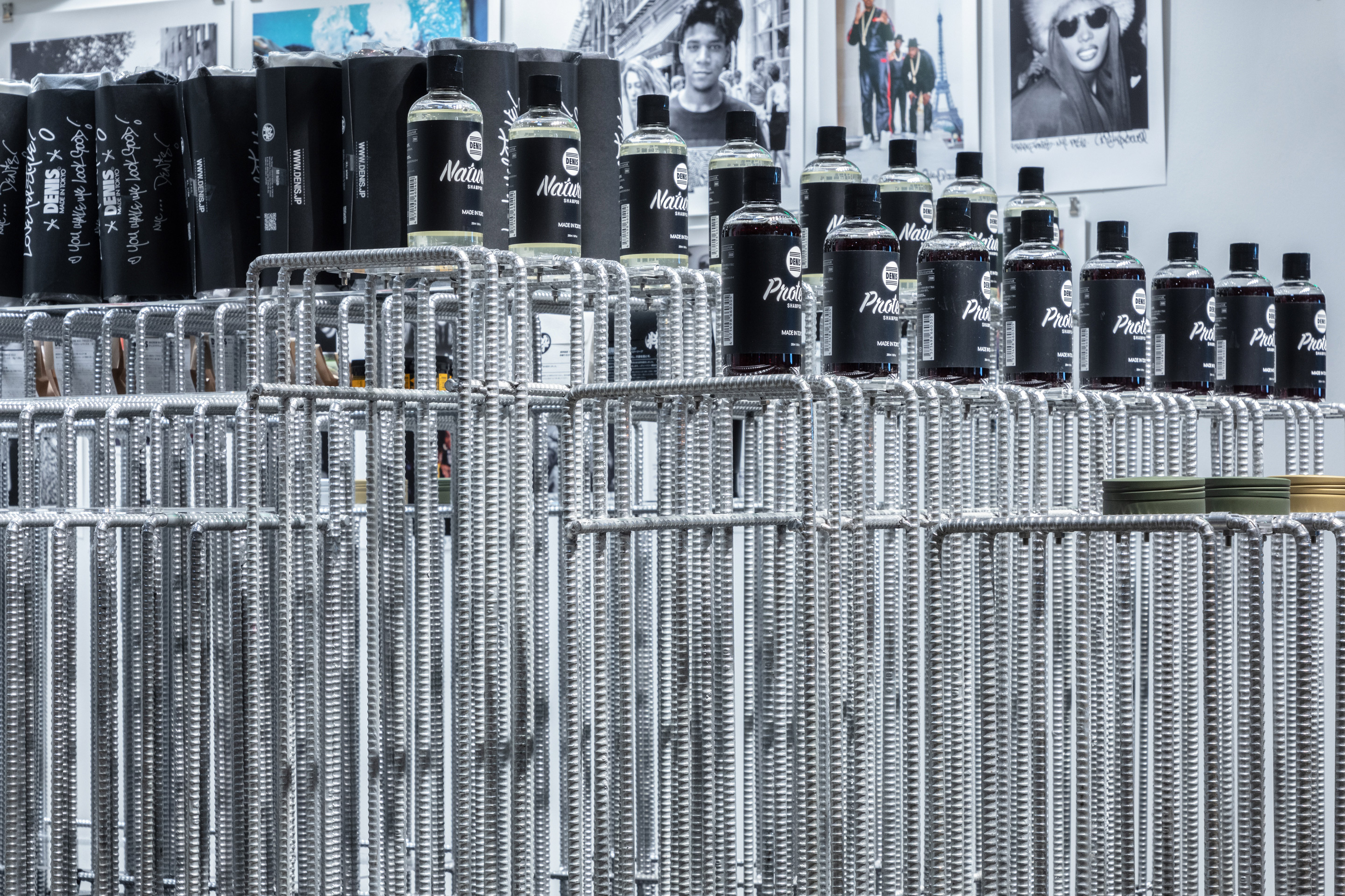 When designing the display fixtures of their particular products, we chose to use rugged and solid materials that can be found on the streets: concrete blocks and steel reinforcement bars. We tried to create a space that beautifully re-edits the rough and masculine materials to advocate our opinion on the current consumerism-driven cityscape, which is also suitable for the store environment as well as DENIS TOKYO’s brand concept.