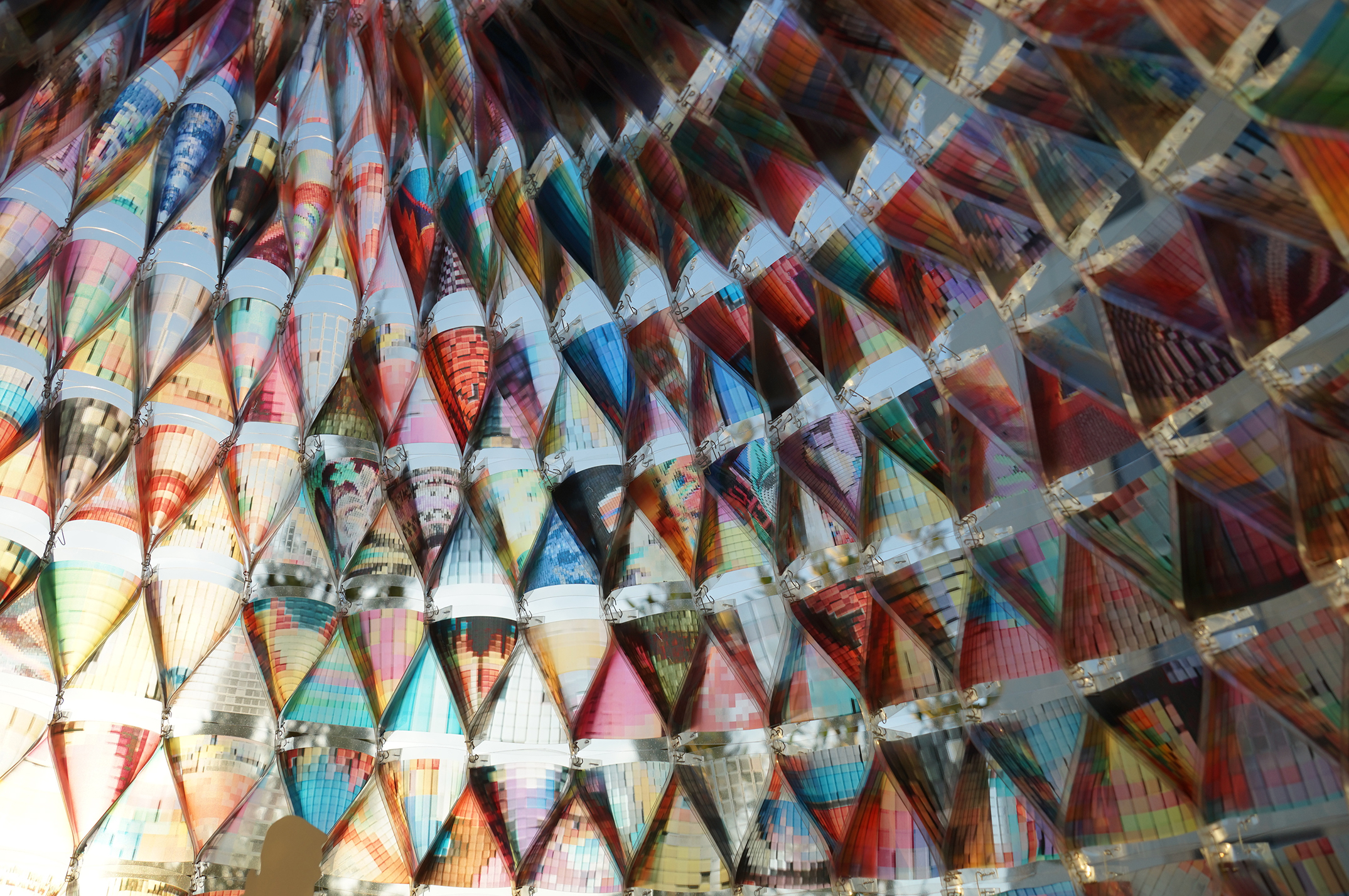 兼有柔和性和强度的防灾头巾连在一起,变成了轻量级堆砌结构建筑。这一结构看似有矛盾,像天方夜谭,但经过实践,证实了其可行性。下方的头巾为承受来自上方的重量,增加了空气加压材料的厚度和密度,中间还加上了透明亚克力棒来加固。各层头巾,都做了相应的强度调整。头巾上印制的图案有意借用了业主设计的服装风格之多色风格,整体营造出充满光和色彩的梦幻空间。该项目最后拆掉后,所用头巾全部赠与其他震灾国家,提高近年地震高发地区的防灾安全意识,从而也实现了业主的初衷,即、‘日式设计’的要求。