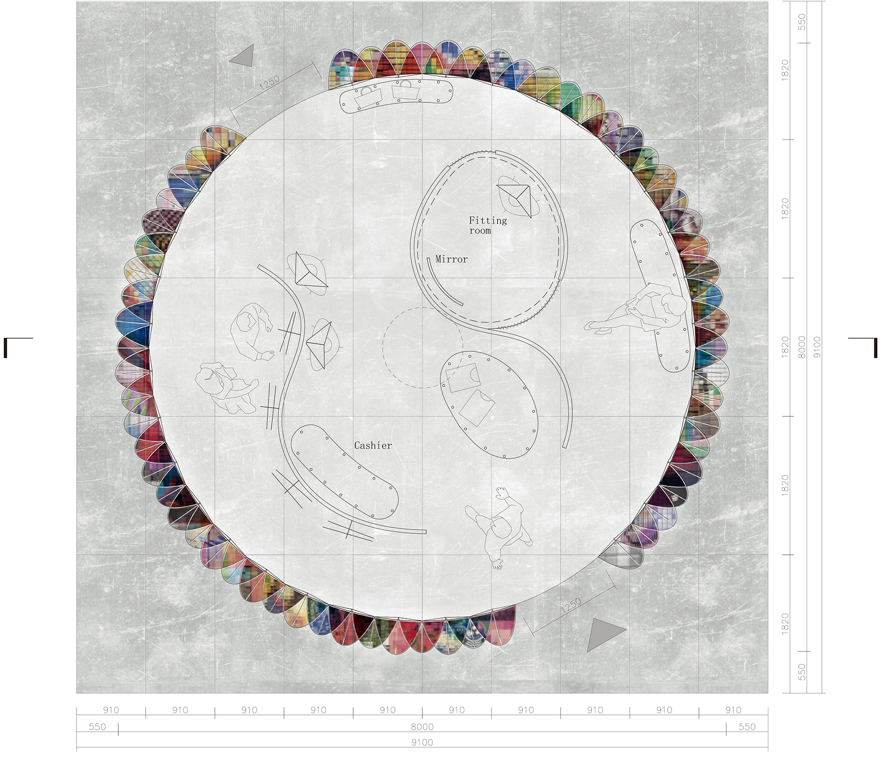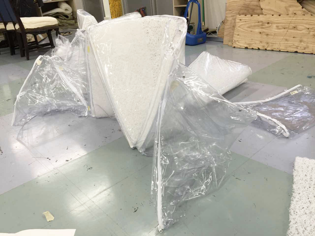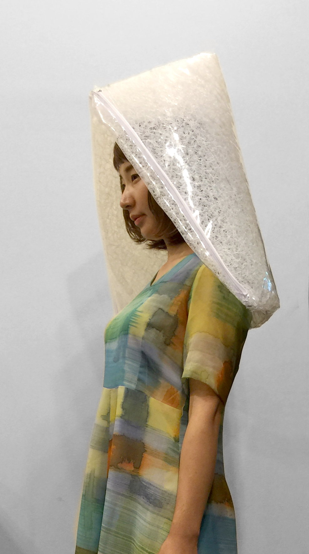 The disaster prevention hoods, with the combination of softness and strength, are linked together, piling up to a lightweight frame structure. This structure appears to have contradictory, but its feasibility has been proved by practice. The hoods underneath support the weight from above, increasing thickness and density of the air pressurized material. Besides, transparent acrylic rods are added inside of the hoods to reinforce the structure. Different layers of the hoods are made to have corresponding intensity adjustment. The printed pattern on the hoods are designed to have the client’s multi-colored clothing design style, creating a fancy space full of light and colors.