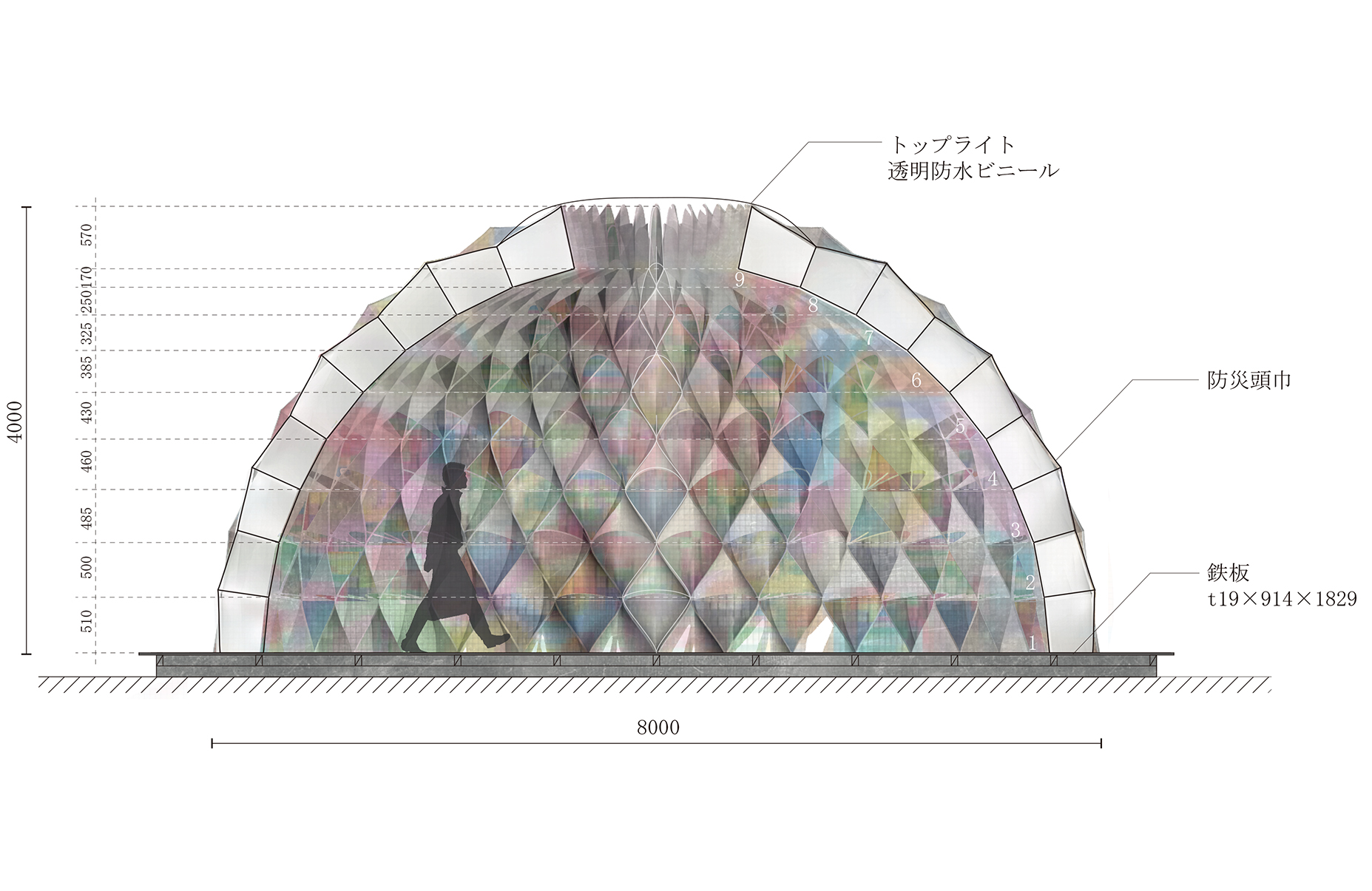 专门定制了一种具有穿透性的防灾头巾,共有1000条,将其全部连接起来,做成了一个直径8m、高度4m的半圆球形轻量级建筑。结构特点为:①谁都能自己轻松组装,施工便捷简易。②为了让半圆球形保持头巾的柔软曲线美,避免采用在头巾端部加一圈硬性结构材料来做框架结构,而是选择BREATHAIR(柔软且具有高度反弹性的垫子材料),用防水拉链和磁铁将头巾连在一起。