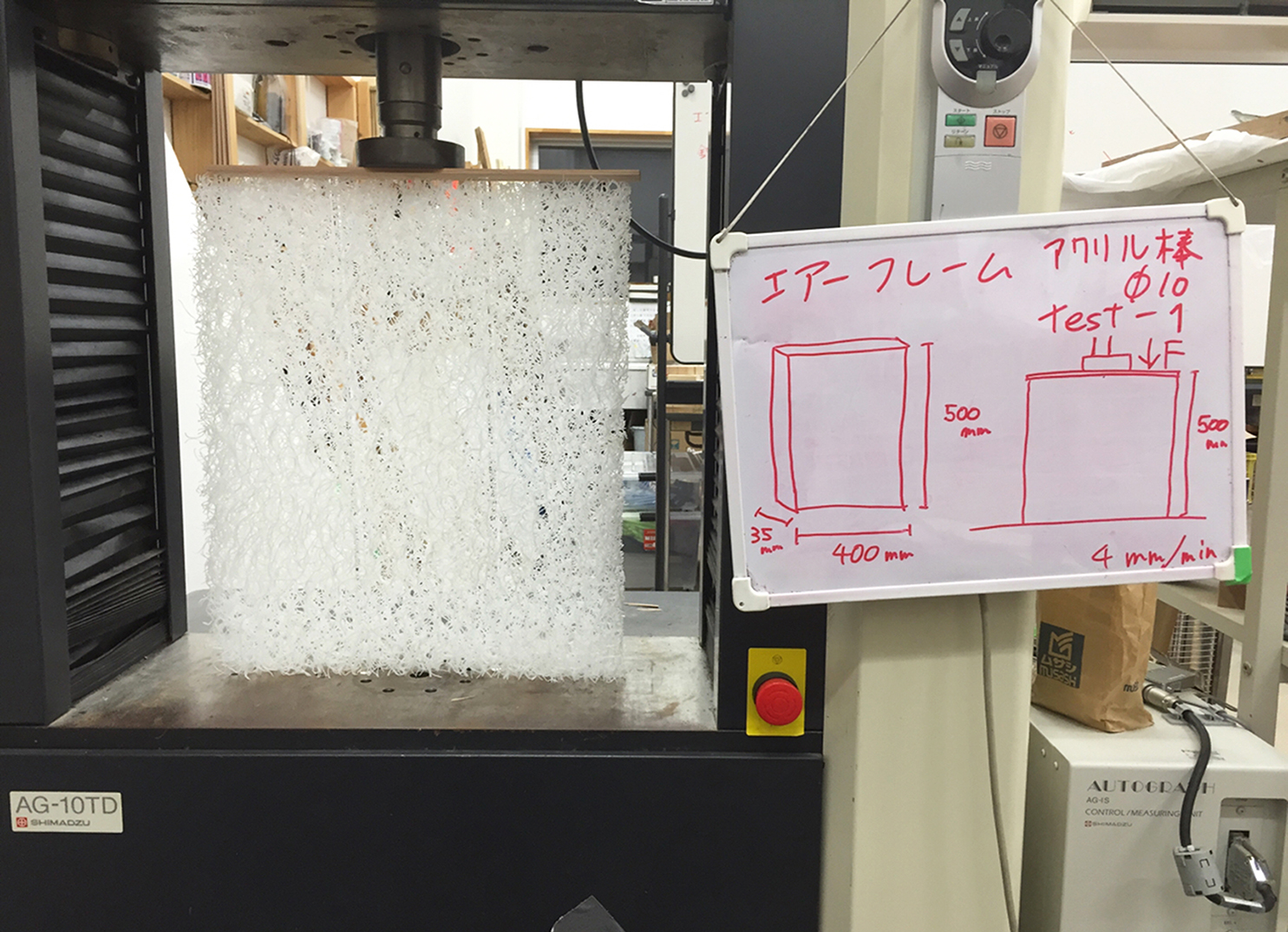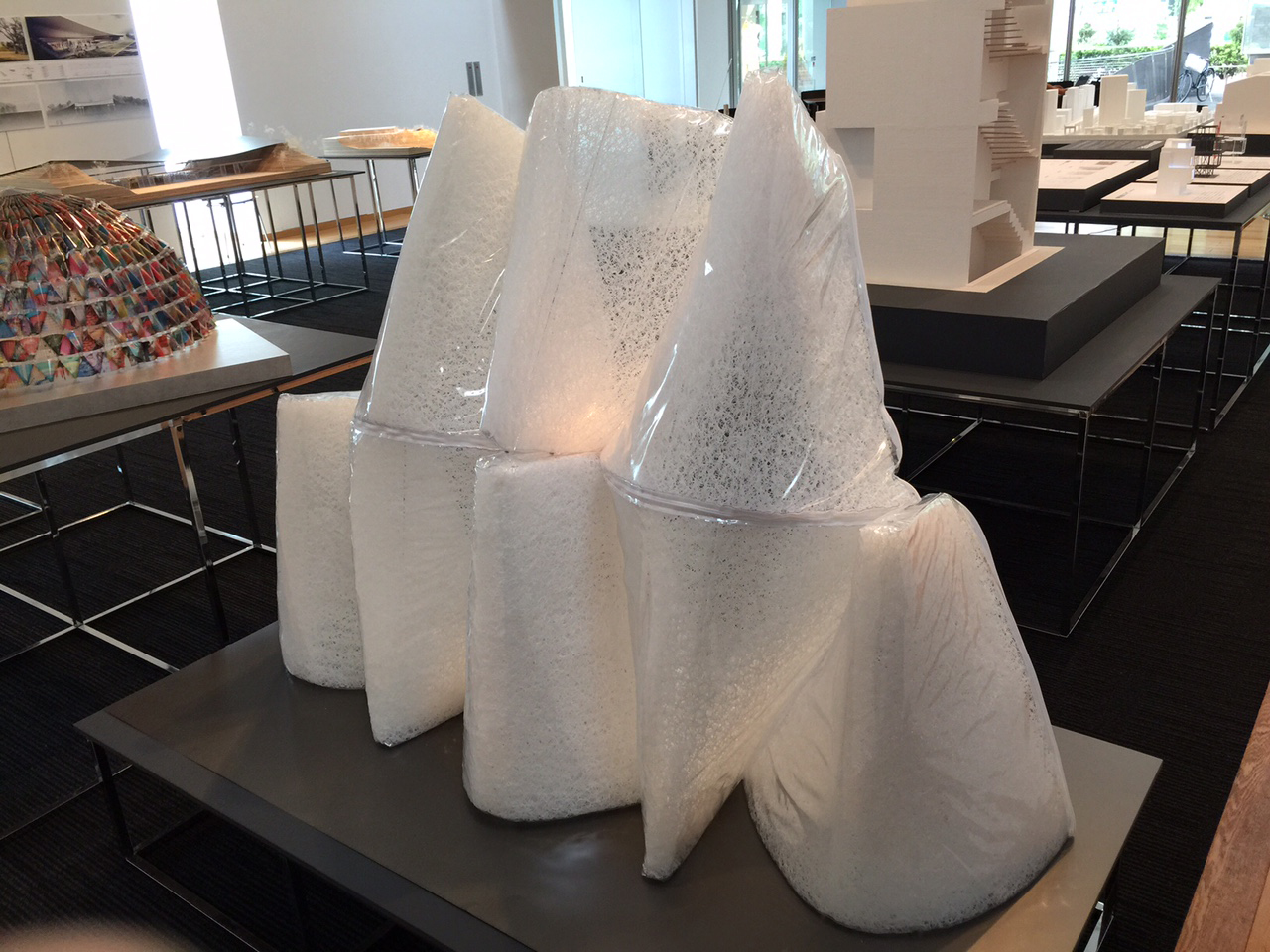 1つ1つの防災頭巾が柔らかさの中に強度を併せ持ち連結することで、軽量材の組積造という一見矛盾のあるような構造を試みた。下段の頭巾は上段からの自重に耐えられるよう、ブレスエアーの厚み・密度を高くしたり、中に透明なアクリル棒を入れて補強したりするなど、段により頭巾の強度を変化させている。またデザイナーの色彩豊かな衣装コレクションの抽象化したパターンを頭巾に転写することにより、光と色に溢れる空間を目指している。更に解体後は頭巾を地震国に寄付し、近年高まる海外での防災安全意識に対して貢献する形で、施主の日本的なデザインという要求に応えた。